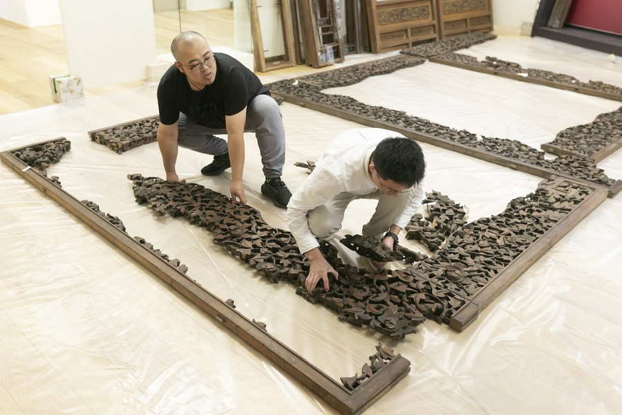 This photo taken on Oct. 16, 2023 shows partial fragments of interior architectural decorations of ancient Chinese buildings at the Slovene Ethnographic Museum in Ljubljana, Slovenia. (Photo by Zeljko Stevanic/Xinhua)