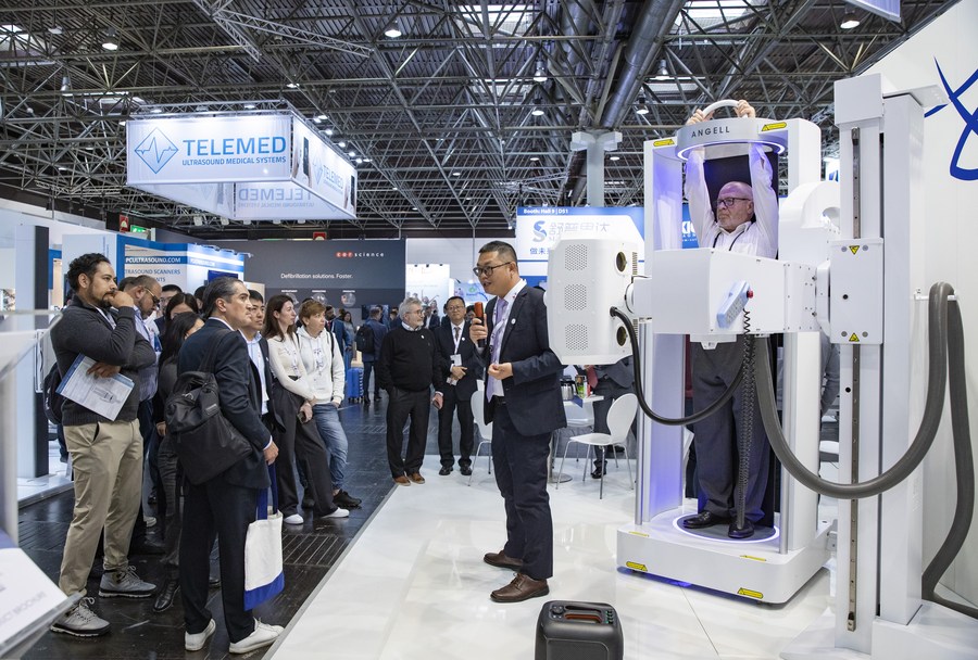 Visitors get information of a newly launched medical equipment at the booth of Angell during the Medica 2023 in Duesseldorf, Germany, Nov. 13, 2023. (Xinhua/Zhang Fan)