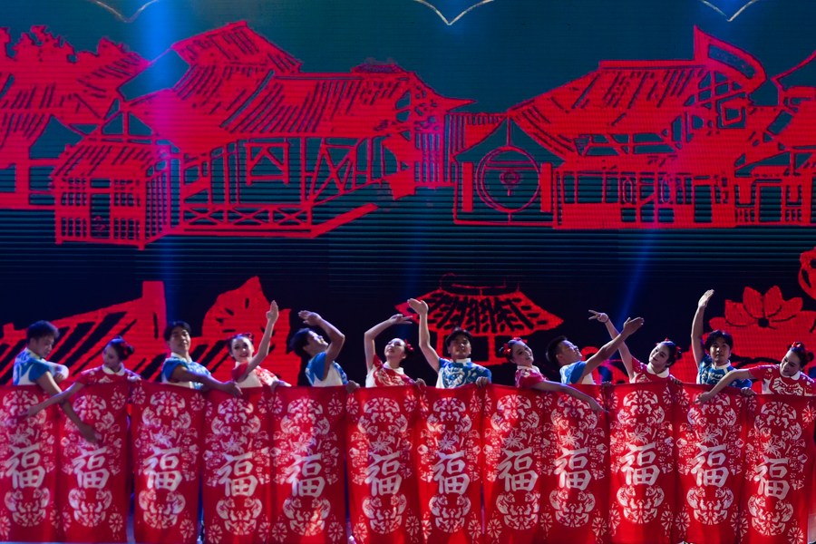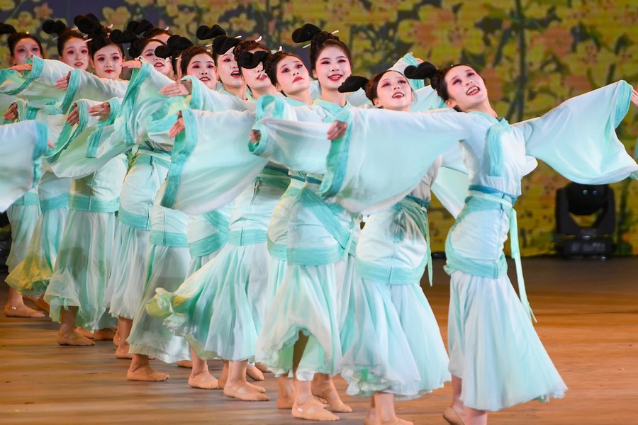 People perform during a popularizing event of square dance in Huanggang, central China's Hubei Province, Sept. 8, 2023. (Photo by Du Zixuan/Xinhua)