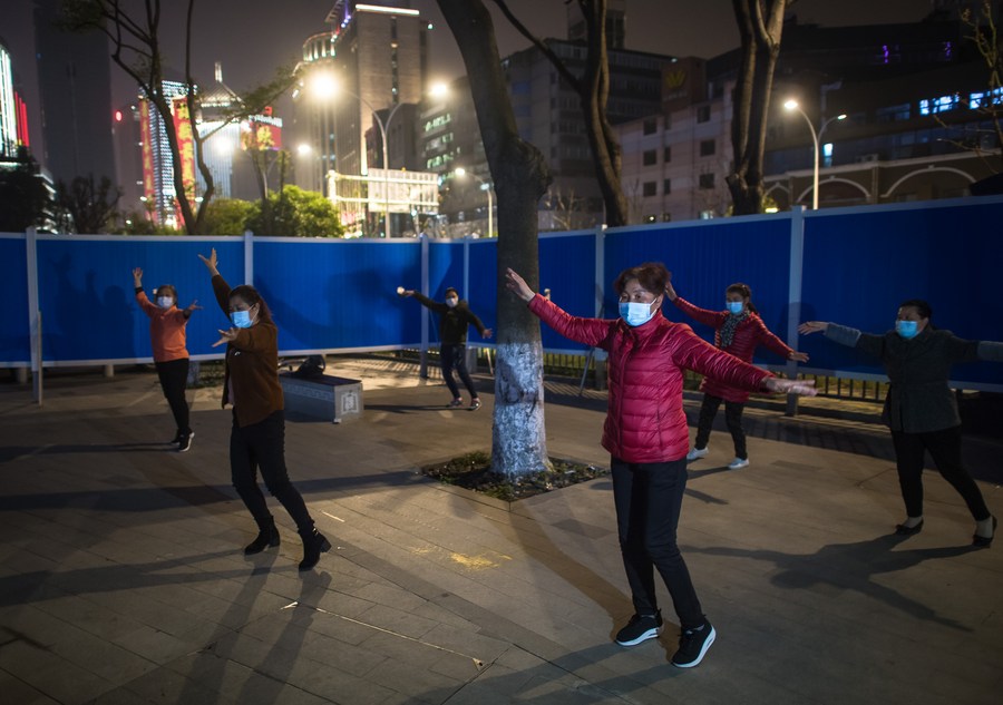 People perform a square dance for fun after dinner in a community of Jianghan District of Wuhan, capital of central China's Hubei Province, April 2, 2020. (Xinhua/Xiao Yijiu)