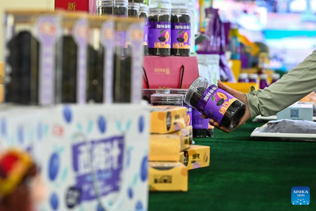 This photo taken on Sept. 2, 2023 shows plum products displayed at a plum industry park in Payzawat, northwest China's Xinjiang Uygur Autonomous Region. (Xinhua/Ding Lei)