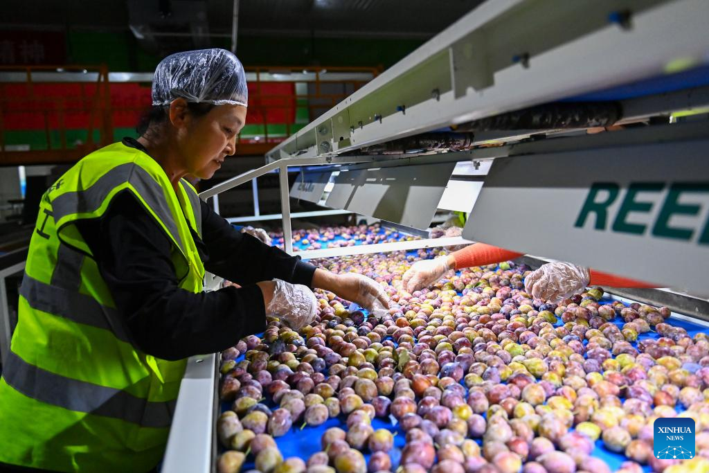 Workers sort out plums on a smart operating line at a plum industry park in Payzawat, northwest China's Xinjiang Uygur Autonomous Region, Aug. 30, 2023. (Xinhua/Ding Lei)