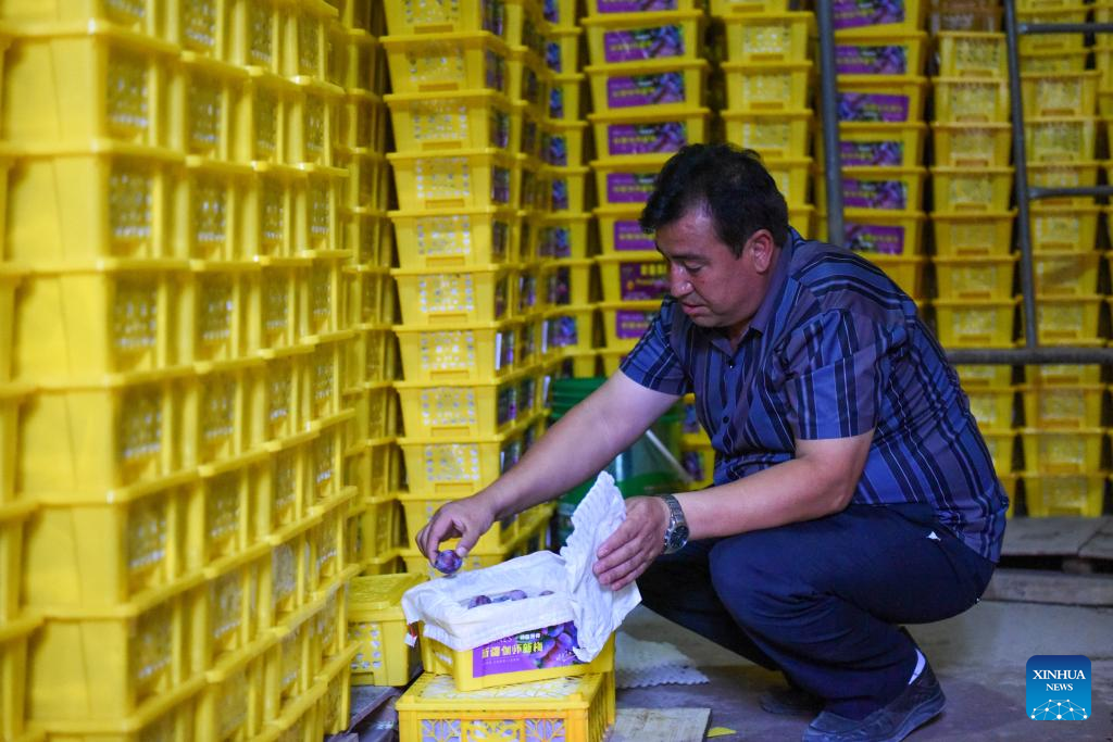 Kurban Hupur checks stored plums at an agricultural cooperative in Payzawat, northwest China's Xinjiang Uygur Autonomous Region, Sept. 4, 2023. (Xinhua/Ding Lei)