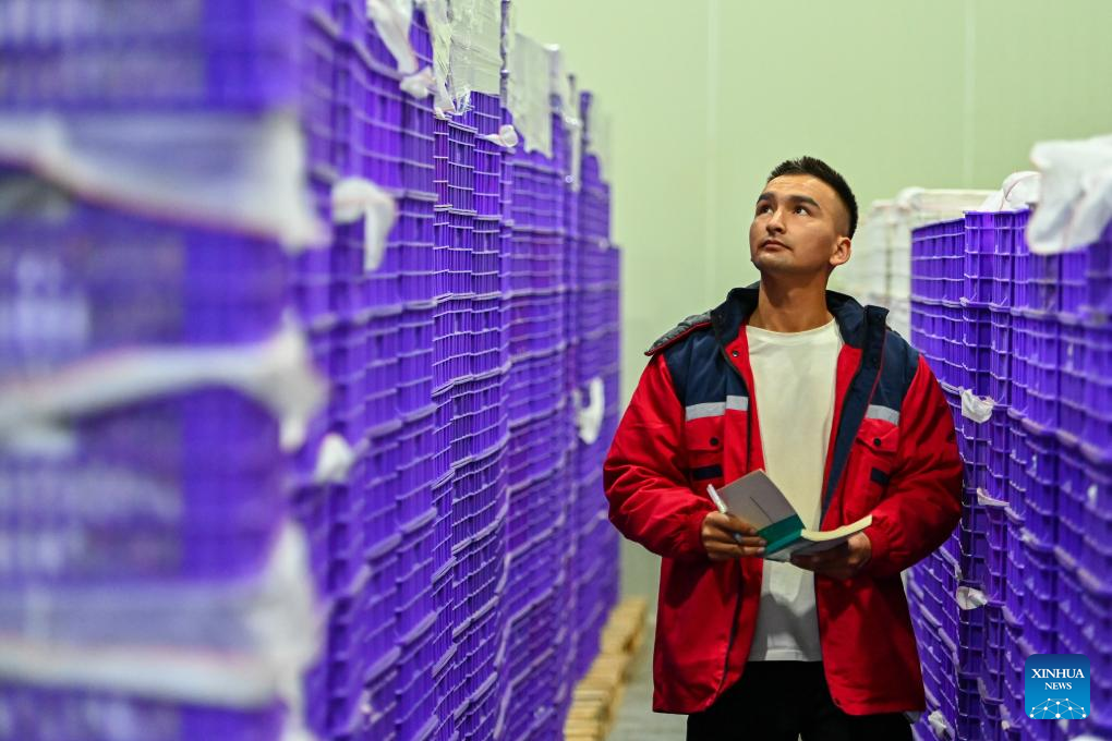 Aiztiali Yimam checks fresh-storage facilities of Doowin Goodies Pilot Plant, an agro-tech company, in Payzawat, northwest China's Xinjiang Uygur Autonomous Region, Sept. 2, 2023. (Xinhua/Ding Lei)