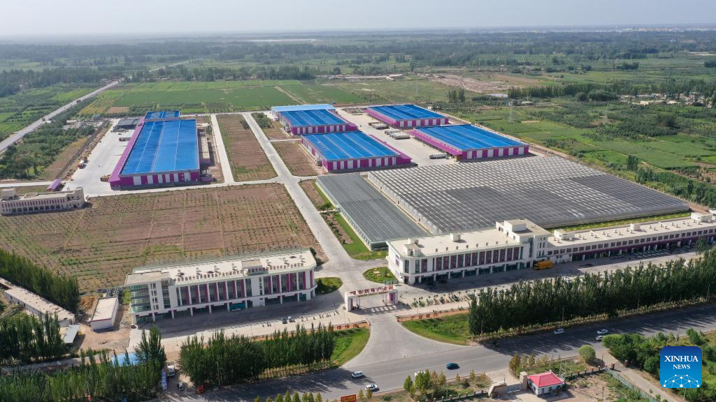 This aerial photo taken on Sept. 2, 2023 shows a plum industry park built with the assistance of south China's Guangdong Province in Payzawat, northwest China's Xinjiang Uygur Autonomous Region. (Xinhua/Ding Lei)
