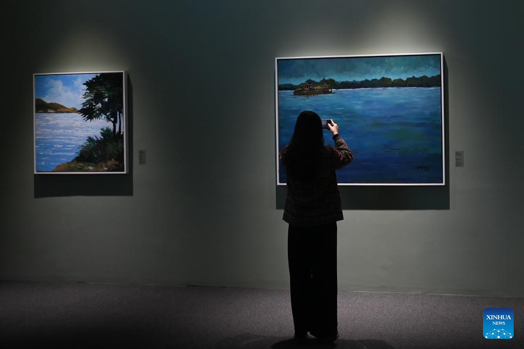 A woman takes photos of a painting at the art exhibition of "Silk Road Artists' Rendezvous" in Hangzhou, capital of east China's Zhejiang Province, Dec. 3, 2023. An art exhibition opened as a sideline event of the first Liangzhu Forum on Sunday in Hangzhou, east China's Zhejiang Province. The exhibition features 152 works created by 84 artists from 83 countries. (Xinhua/Huang Zongzhi)
