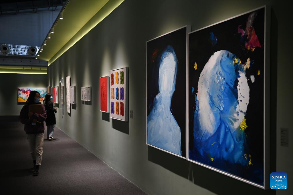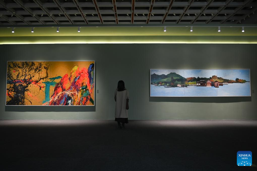 People visit the art exhibition of "Silk Road Artists' Rendezvous" in Hangzhou, capital of east China's Zhejiang Province, Dec. 3, 2023. An art exhibition opened as a sideline event of the first Liangzhu Forum on Sunday in Hangzhou, east China's Zhejiang Province. The exhibition features 152 works created by 84 artists from 83 countries. (Xinhua/Huang Zongzhi)