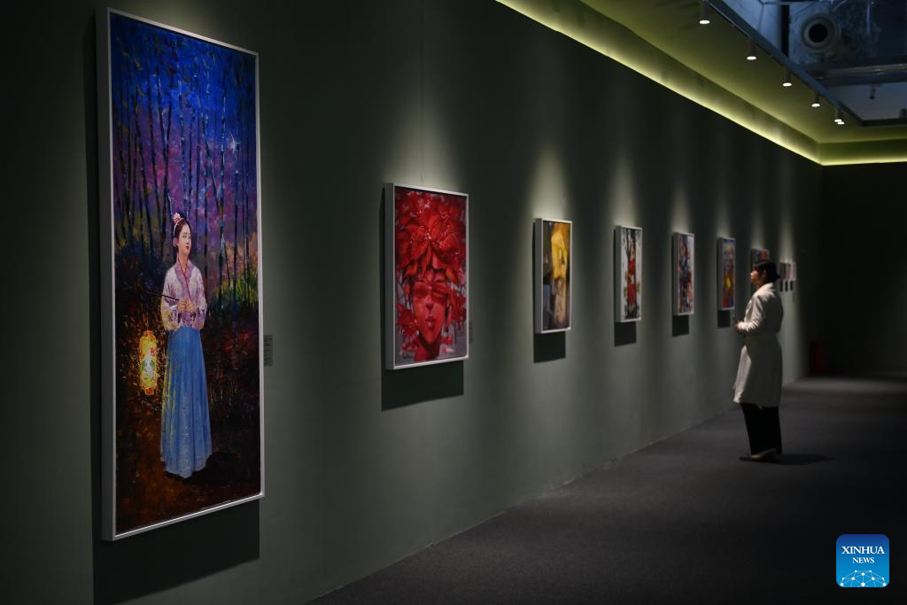 A woman visits the art exhibition of "Silk Road Artists' Rendezvous" in Hangzhou, capital of east China's Zhejiang Province, Dec. 3, 2023. An art exhibition opened as a sideline event of the first Liangzhu Forum on Sunday in Hangzhou, east China's Zhejiang Province. The exhibition features 152 works created by 84 artists from 83 countries. (Xinhua/Huang Zongzhi)