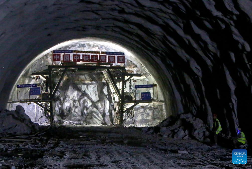 A worker operates at Phupa Tunnel in southwest China's Xizang Autonomous Region, Dec. 4, 2023. The main body of an expressway that will link the cities of Lhasa and Xigaze in southwest China's Xizang Autonomous Region was completed on Tuesday.