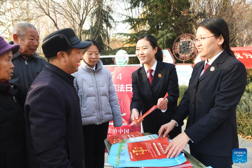 Staff of local people's procuratorate publicizes the Constitution at a park in Xinle of Shijiazhuang, north China's Hebei Province, Dec. 4, 2023. China marked its 10th National Constitution Day on Monday. (Photo by Jia Minjie/Xinhua)