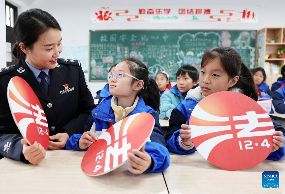 A police officer introduces the Constitution to students at a school in Taizhou, east China's Jiangsu Province, Dec. 4, 2023. China marked its 10th National Constitution Day on Monday. (Photo by Tang Dehong/Xinhua)