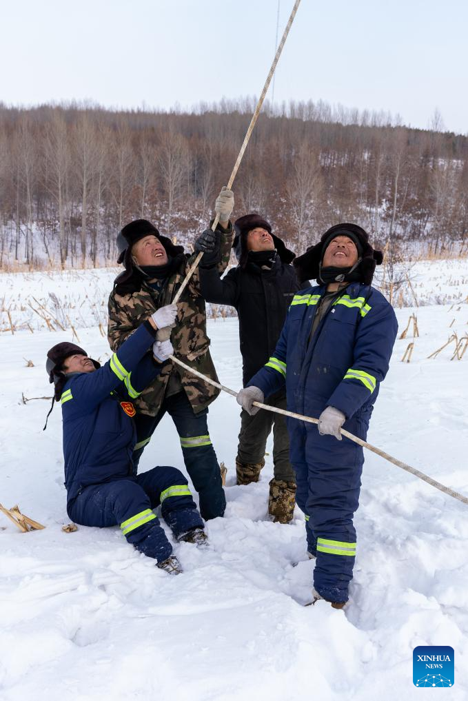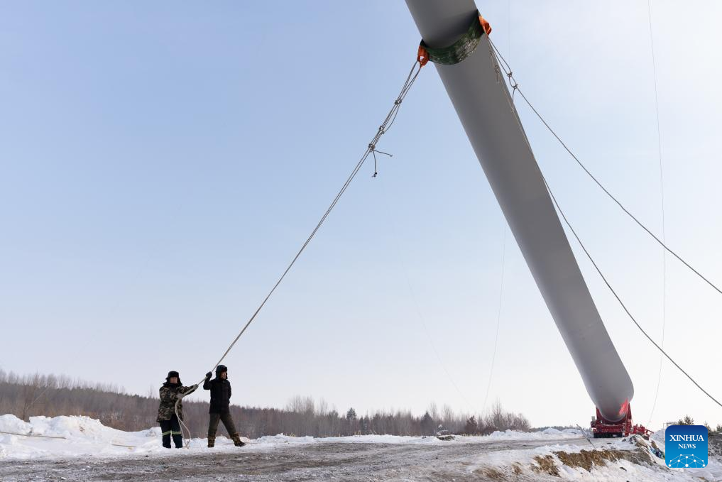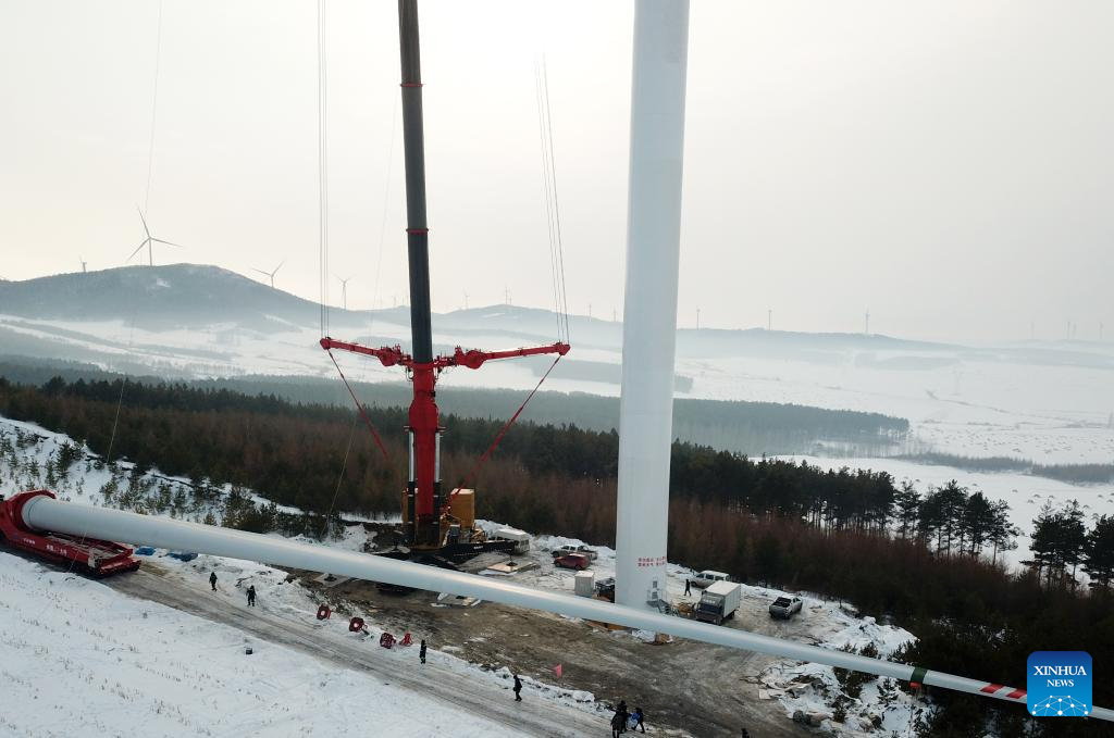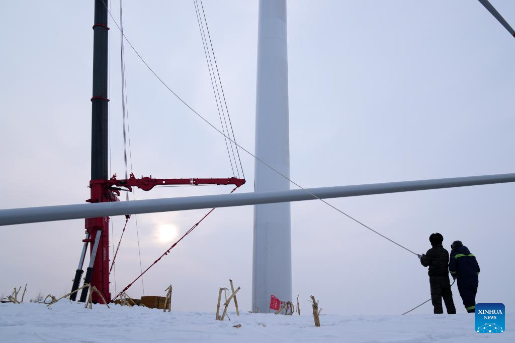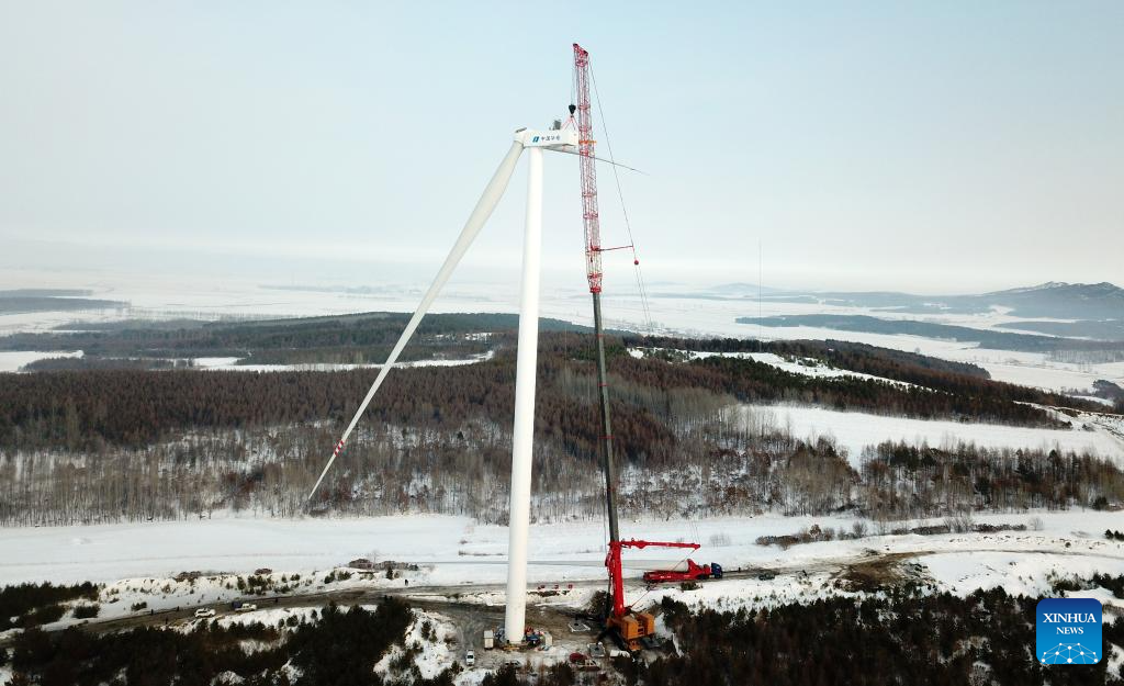 Staff members work at the construction site of a wind farm in Yilan County, northeast China's Heilongjiang Province, Dec. 5, 2023. Heilongjiang, the northernmost province in China, is now largely covered in ice and snow, but the construction and operation of the 200-megawatt fourth phase of a wind farm project in Yilan County of the province are by no means "frozen."