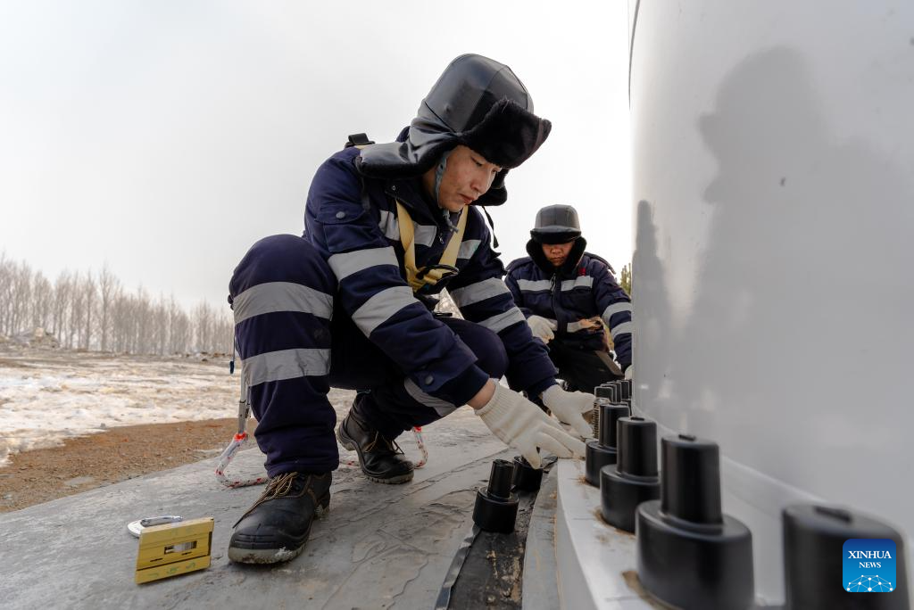 Staff members perform routine check at a wind turbine in operation in Yilan County, northeast China's Heilongjiang Province, Dec. 5, 2023. Heilongjiang, the northernmost province in China, is now largely covered in ice and snow, but the construction and operation of the 200-megawatt fourth phase of a wind farm project in Yilan County of the province are by no means "frozen."