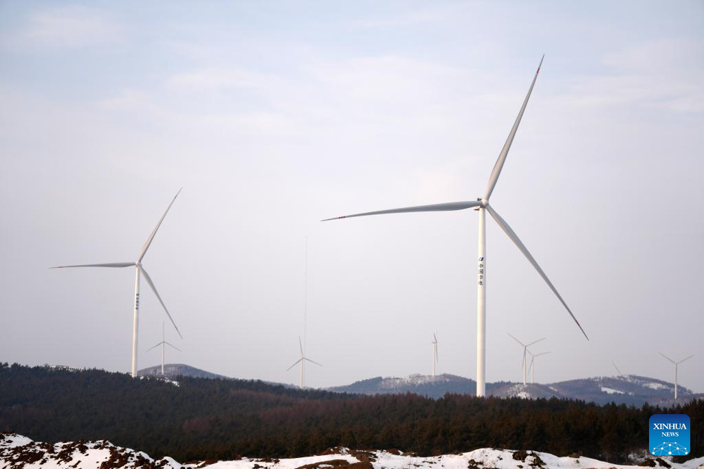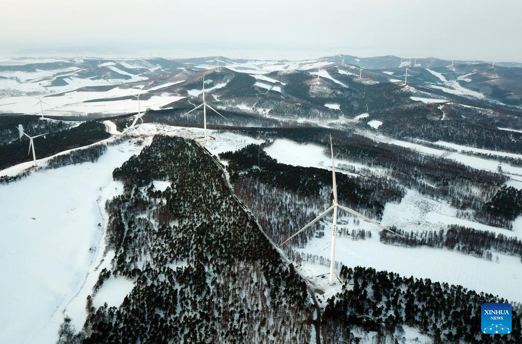 This photo taken on Dec. 5, 2023 shows wind turbines in operation in Yilan County, northeast China's Heilongjiang Province. Heilongjiang, the northernmost province in China, is now largely covered in ice and snow, but the construction and operation of the 200-megawatt fourth phase of a wind farm project in Yilan County of the province are by no means "frozen."