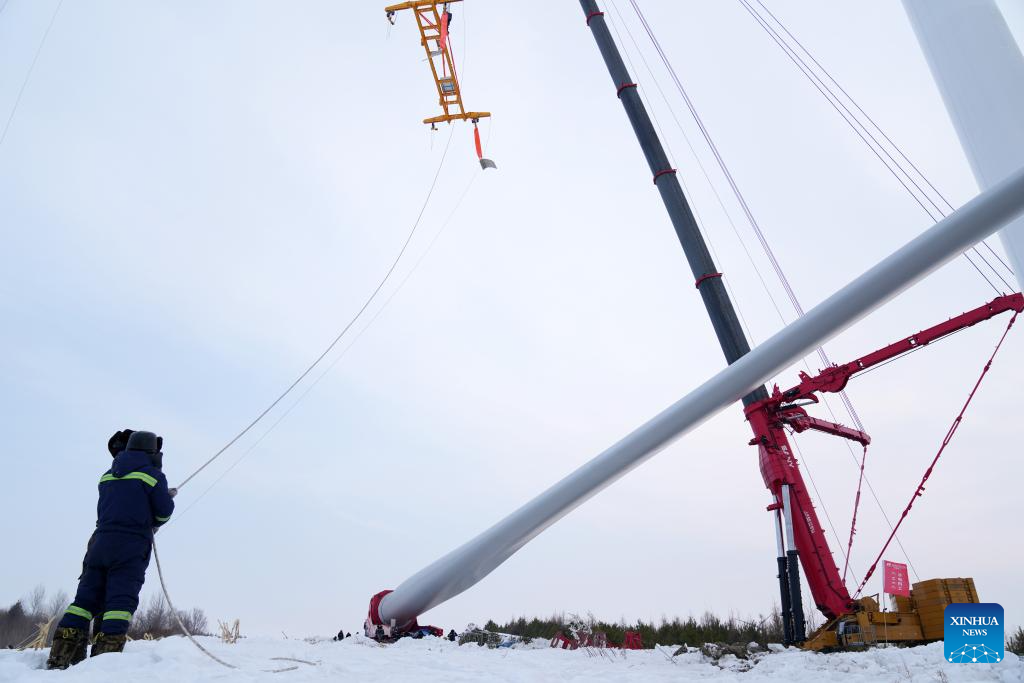 A staff member works at the construction site of a wind farm in Yilan County, northeast China's Heilongjiang Province, Dec. 5, 2023. Heilongjiang, the northernmost province in China, is now largely covered in ice and snow, but the construction and operation of the 200-megawatt fourth phase of a wind farm project in Yilan County of the province are by no means "frozen."