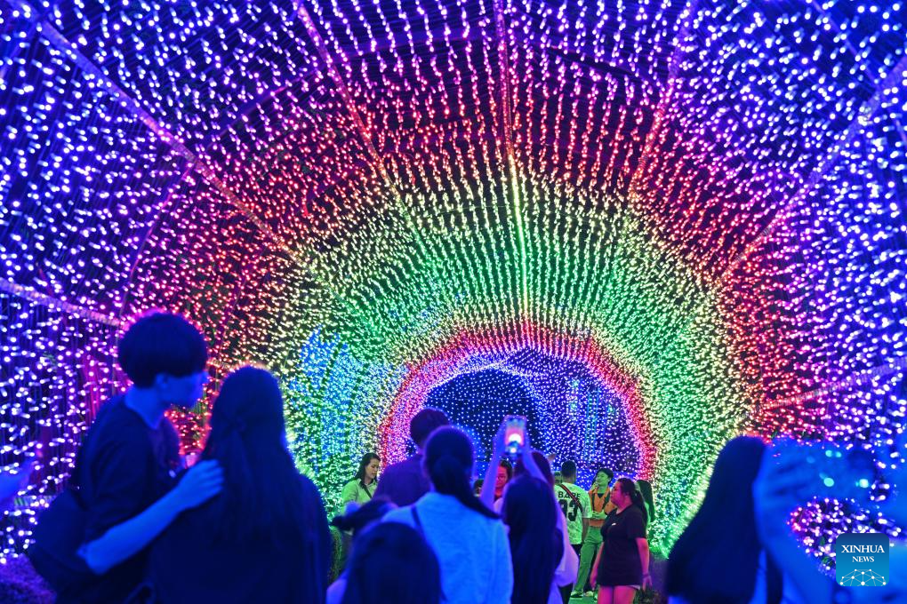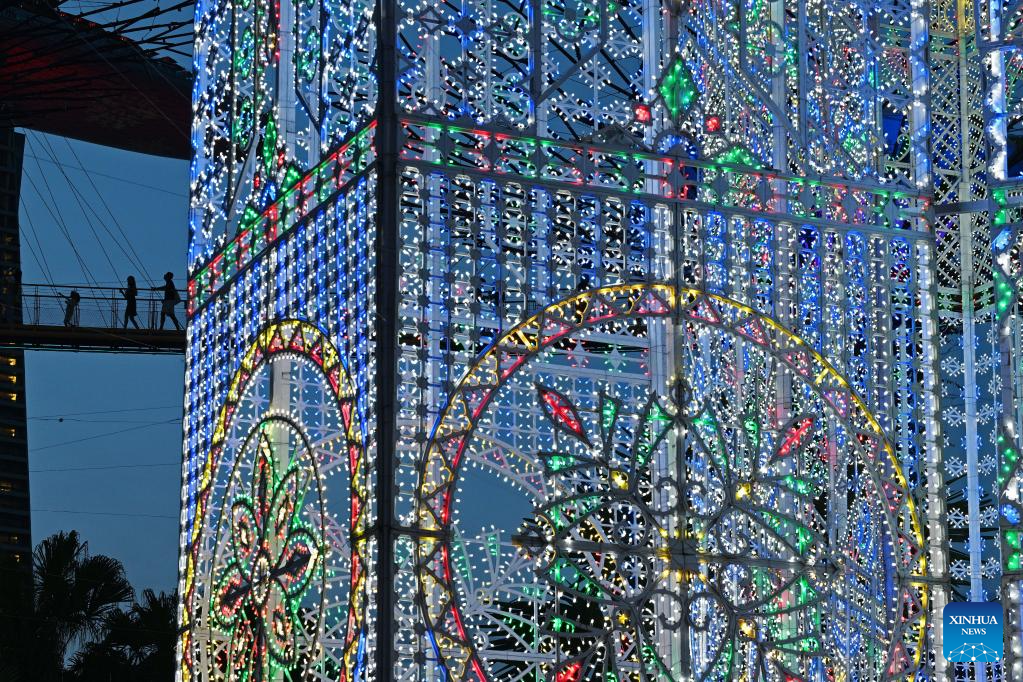 People view light installations for Christmas at Singapore's Gardens by the Bay on Dec. 18, 2023. (Photo by Then Chih Wey/Xinhua)