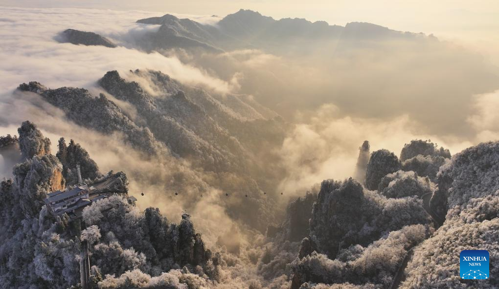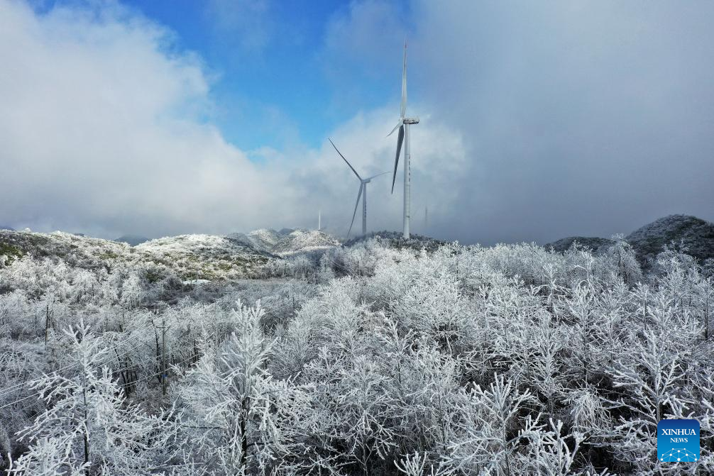 This aerial photo taken on Dec. 19, 2023 shows the rime scenery in Fanshen Village of Xiangxi Tujia and Miao Autonomous Prefecture, central China's Hunan Province. (Photo by Zeng Xianghui/Xinhua)