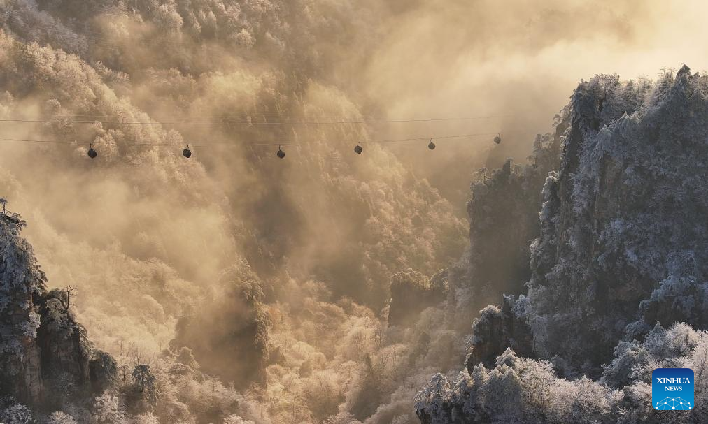 This aerial photo taken on Dec. 19, 2023 shows tourists enjoying the snow scenery at a national forest park in Yongzhou City, central China's Hunan Province. (Photo by Zhou Xiuyuchun/Xinhua)
