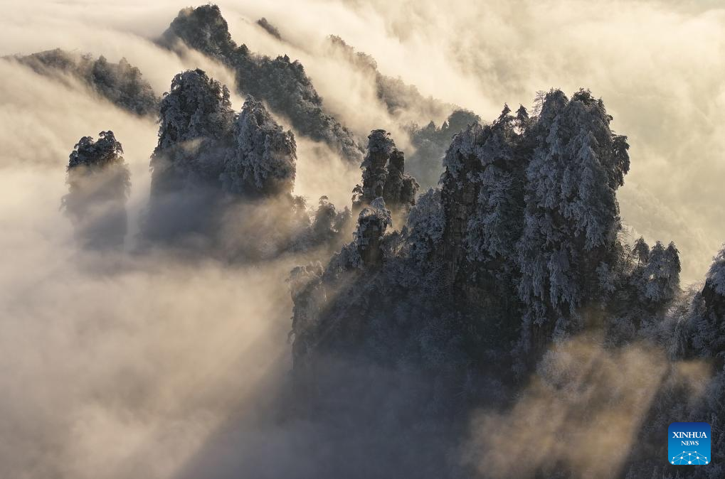 This aerial photo taken on Dec. 19, 2023 shows mountains amid mist after a snowfall in a national forest park of Zhangjiajie, central China's Hunan Province. (Xinhua/Wu Yongbing)