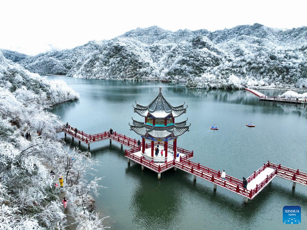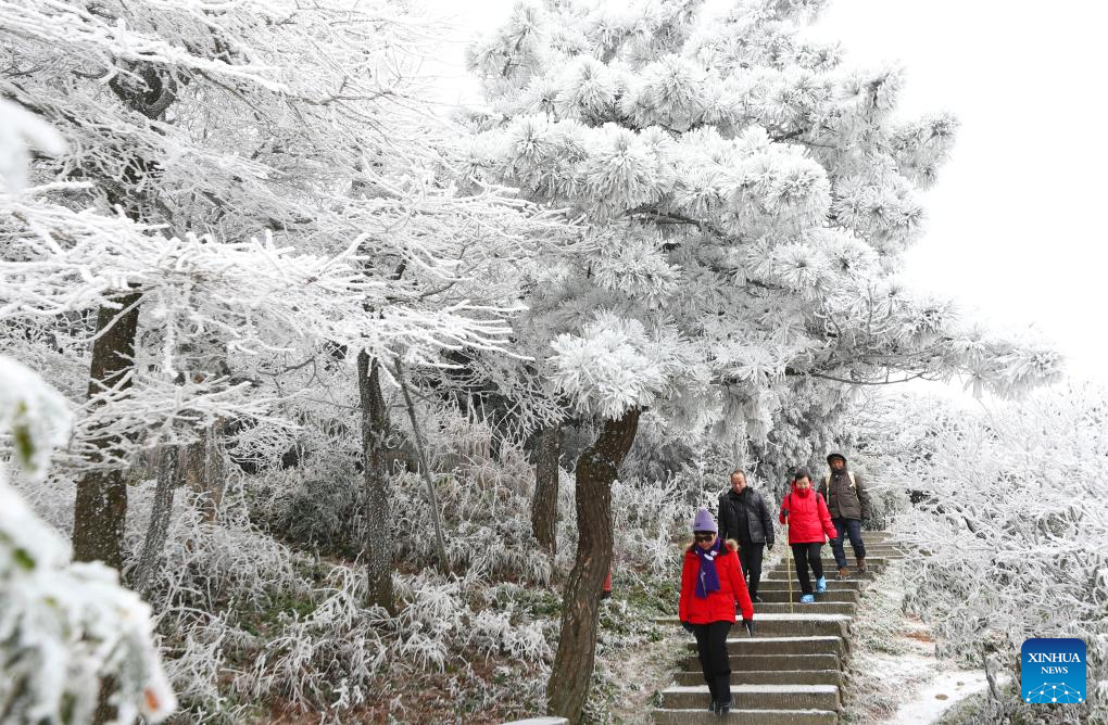 Tourists enjoy the snow scenery at the Hengshan Mountain scenic spot in Hengyang, central China's Hunan Province, Dec. 19, 2023. (Photo by Cao Zhengping/Xinhua)
