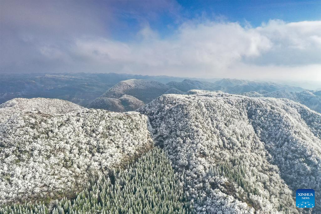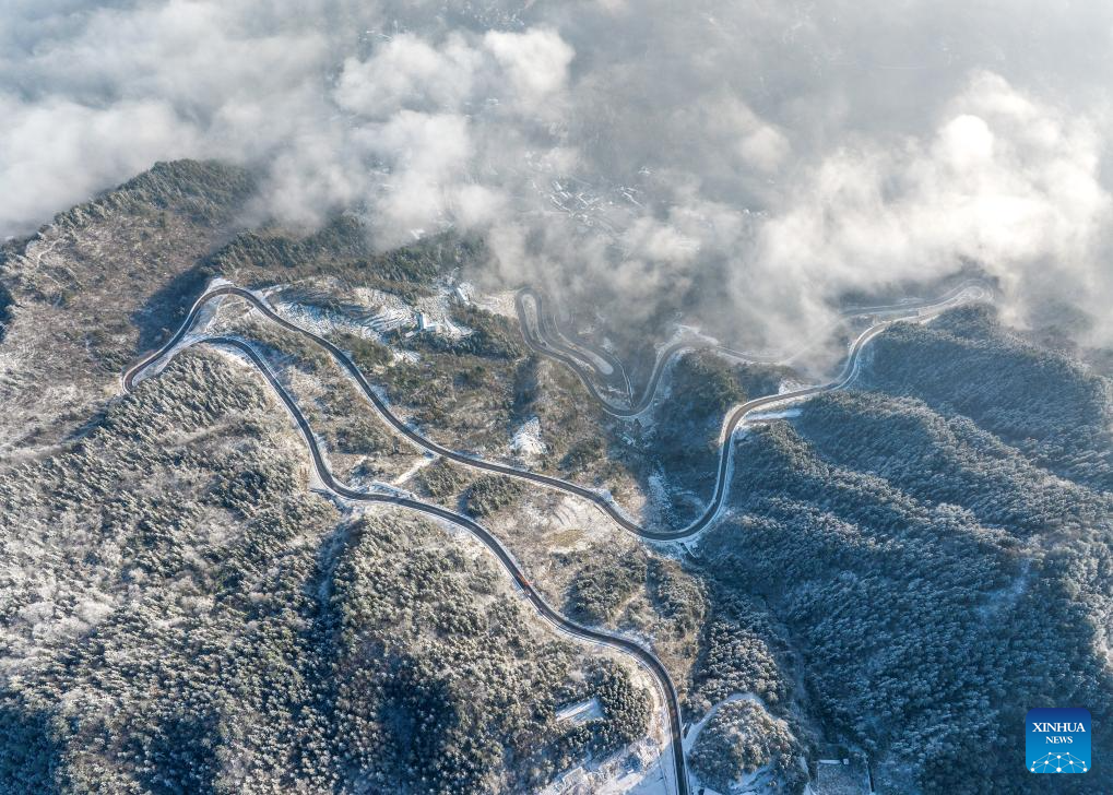 This aerial photo taken on Dec. 19, 2023 shows the snow scenery in Bijie, southwest China's Guizhou Province. (Photo by Li Hua/Xinhua)