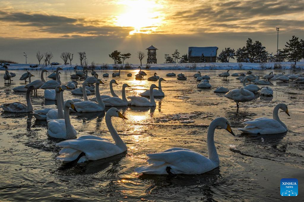Swans are pictured after a snowfall in Lidao Township of Rongcheng City, east China's Shandong Province, Dec. 19, 2023. (Photo by Li Xinjun/Xinhua)