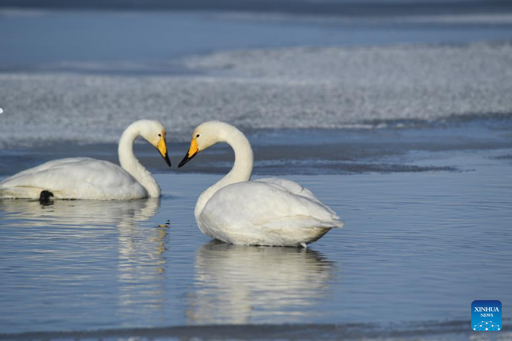 This photo taken on Dec. 18, 2023 shows swans at a reservoir in the Kazak Autonomous County of Aksay in northwest China's Gansu Province. (Photo by Gao Hongshan/Xinhua)