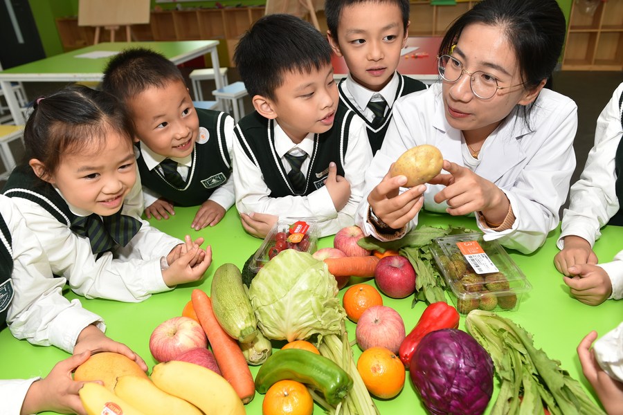 Students learn about healthy eating on the Chinese Student Nutrition Day in Nanjing, capital of east China's Jiangsu Province, Dec. 5, 2023.