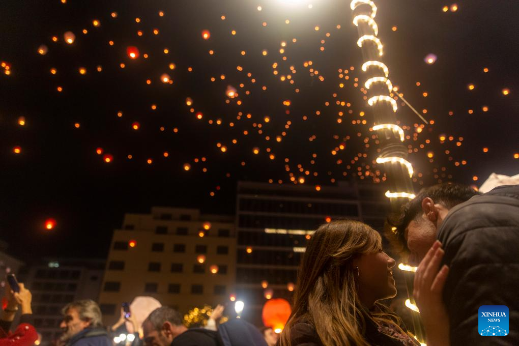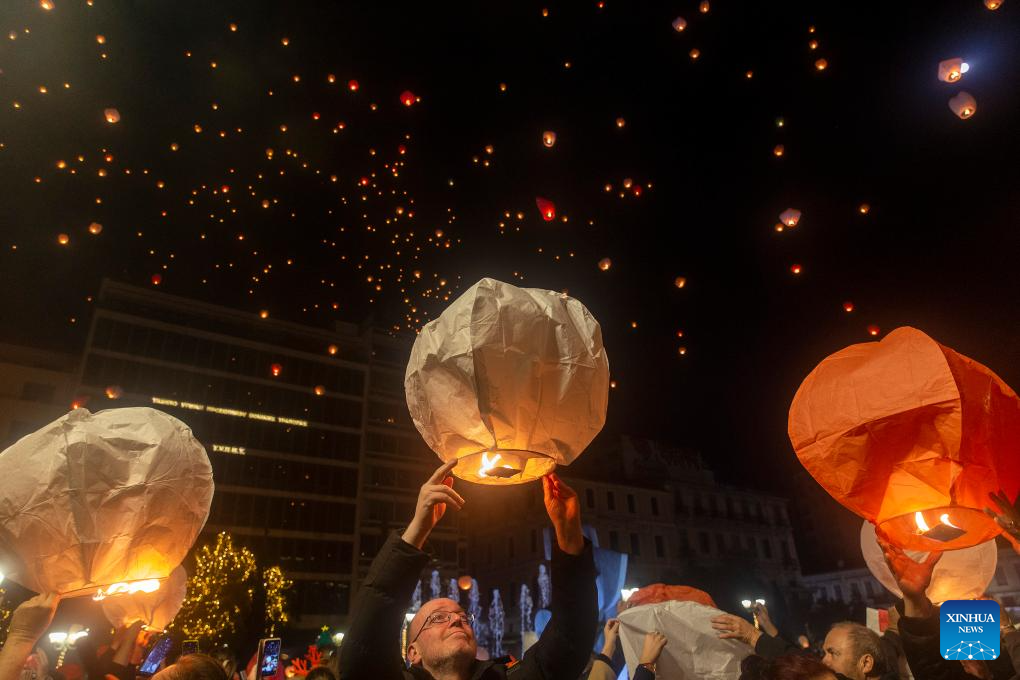 People release sky lanterns at Kotzia square in Athens, Greece, Dec. 24, 2023. The sky of Athens was lit up by sky lanterns carrying people's good wishes on Christmas Eve during the "Night of the Wishes" event which was held here for the second consecutive year. (Xinhua/Marios Lolos)
