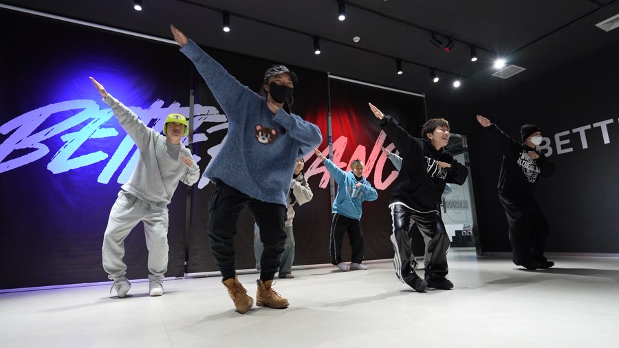 This screenshot captured from a video shows people learning "Kemusan" dance at a street dance training studio in Nanning, south China's Guangxi Zhuang Autonomous Region, Dec. 20, 2023. (Xinhua/Huang Kaiying)