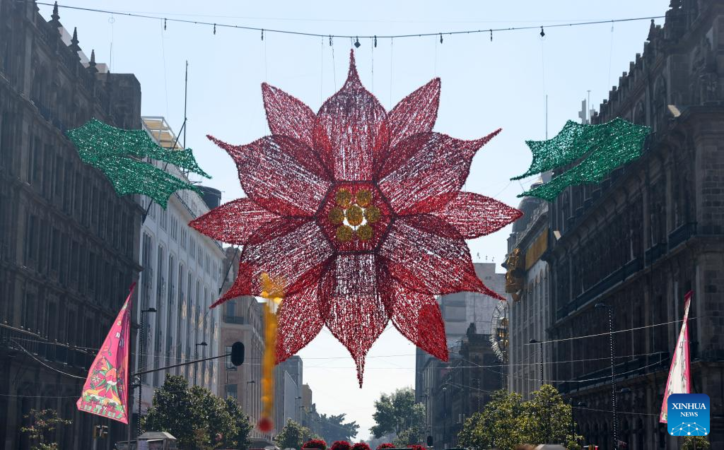 Holiday decorations are seen on a street in Mexico City, Mexico on Dec. 28, 2023. People in Mexico City enjoy themselves as the New Year approaches. (Xinhua/Li Mengxin)