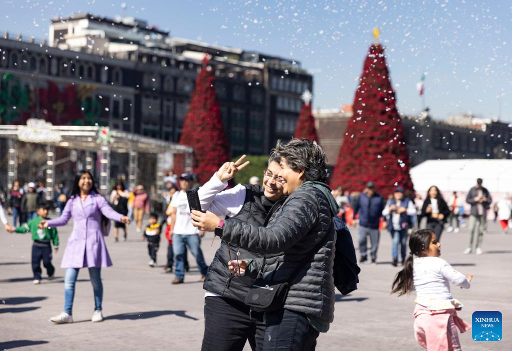 People take selfie amid an artificial snow in Mexico City, Mexico on Dec. 28, 2023. People in Mexico City enjoy themselves as the New Year approaches. (Xinhua/Li Mengxin)