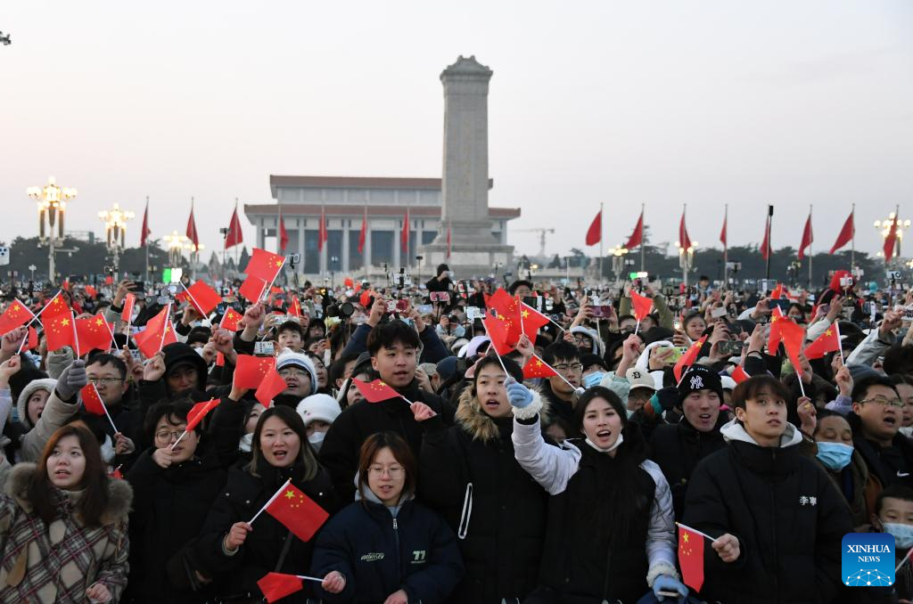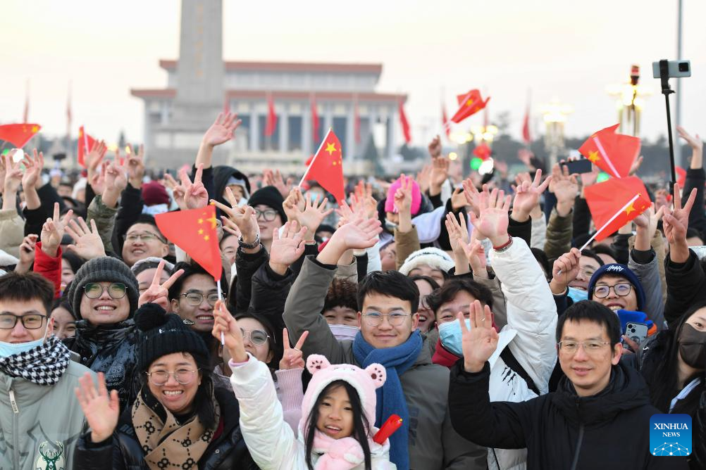 People hail after a grand national flag-raising ceremony at the Tian'anmen Square in Beijing, capital of China, Jan. 1, 2024. (Xinhua/Ren Chao)