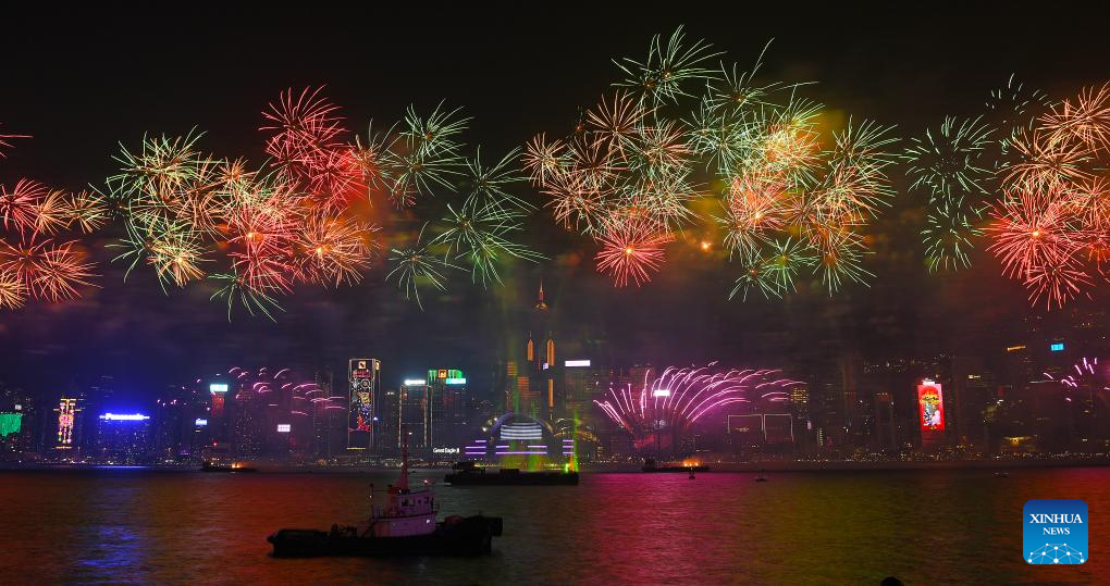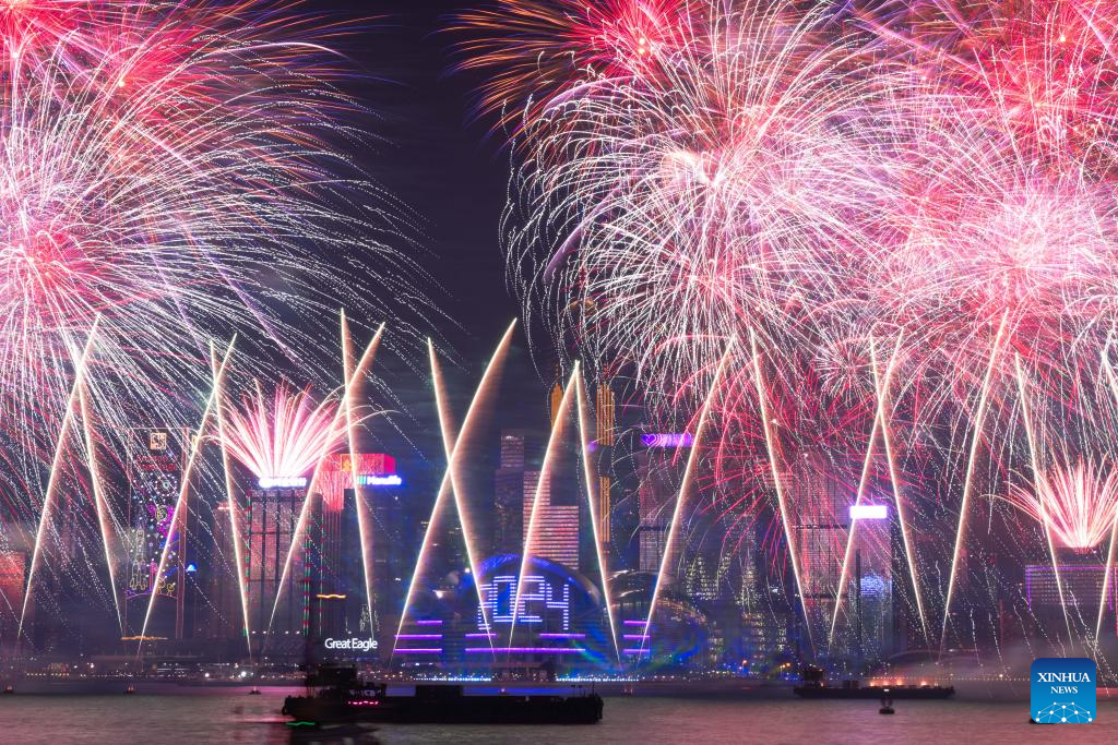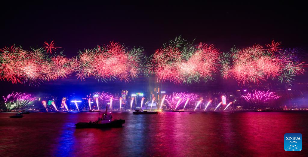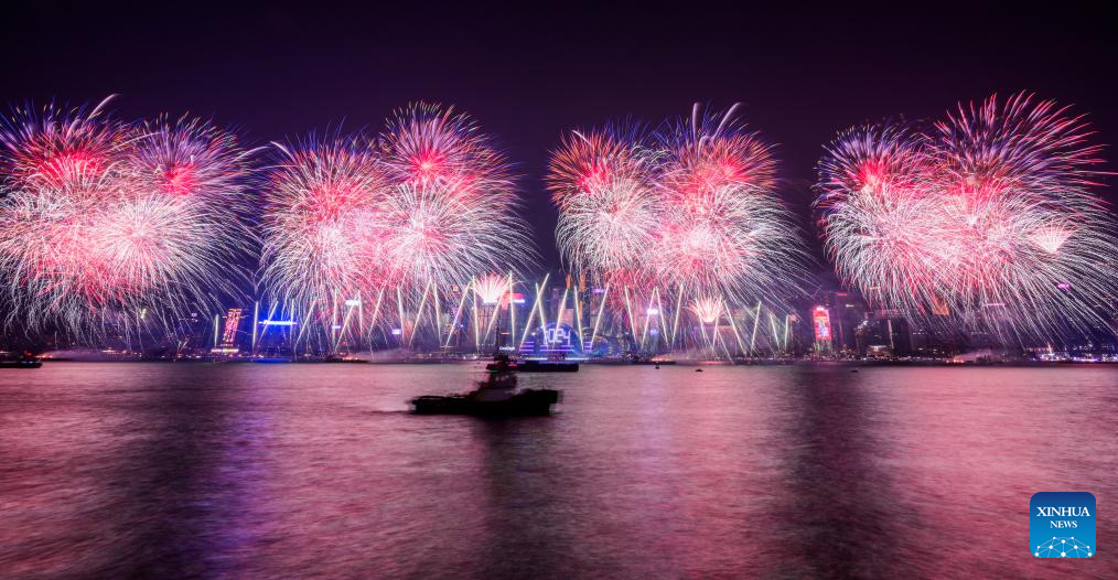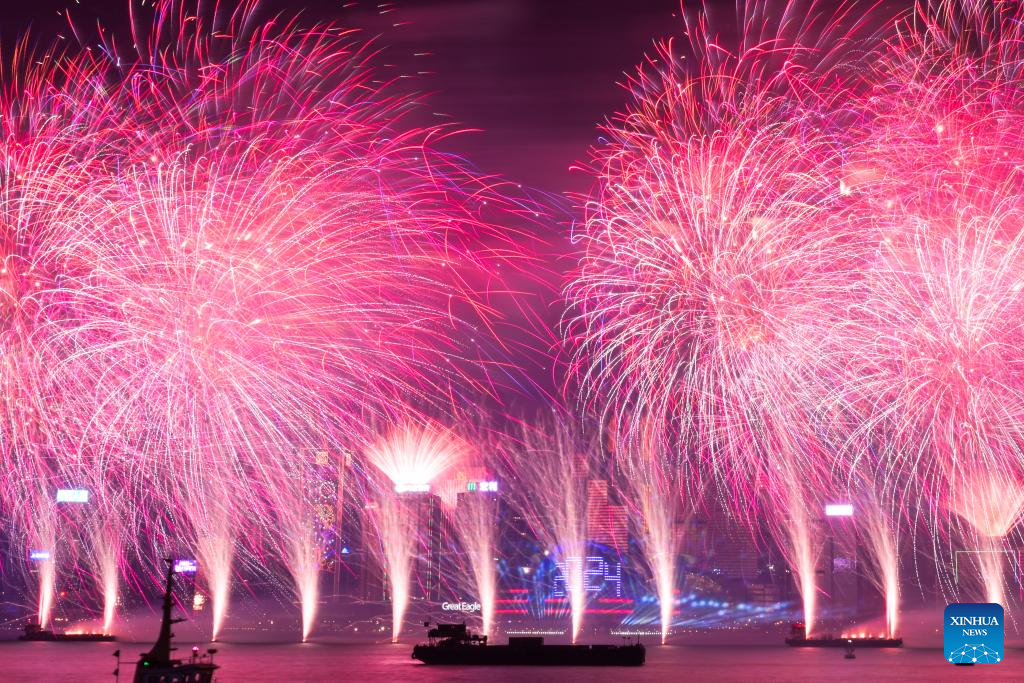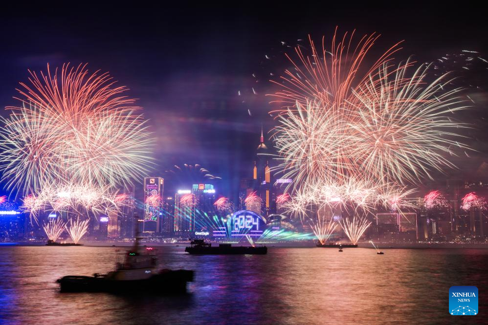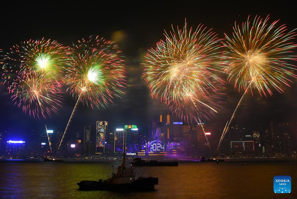 Fireworks in celebration of the New Year illuminate the sky over Victoria Harbour in Hong Kong, south China, Jan. 1, 2024. (Xinhua/Zhu Wei)
