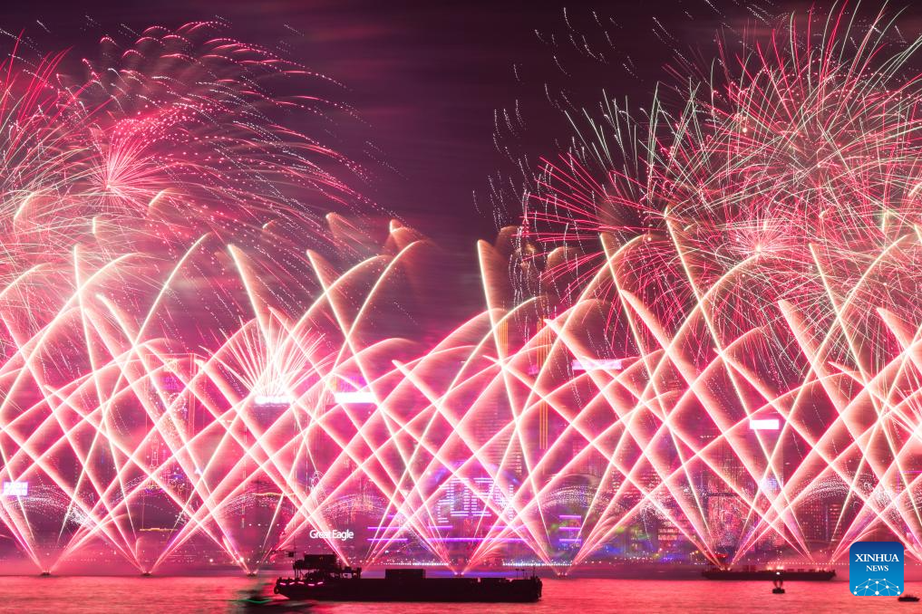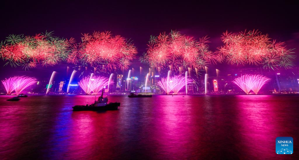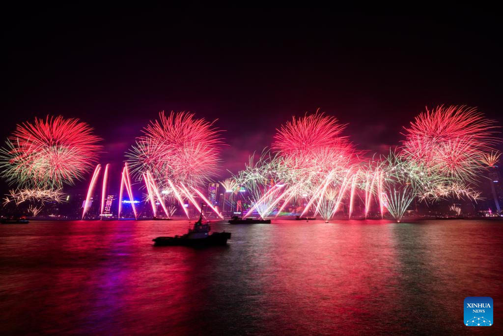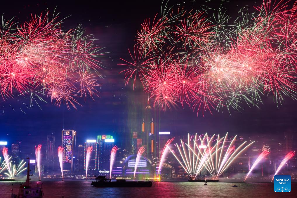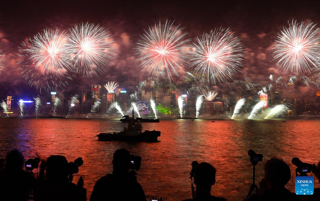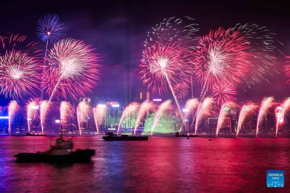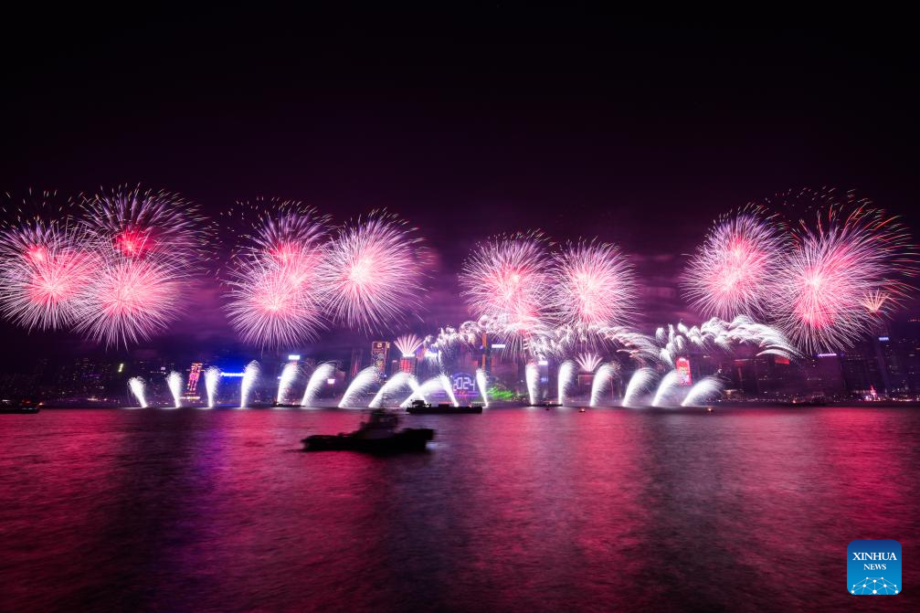 Fireworks in celebration of the New Year illuminate the sky over Victoria Harbour in Hong Kong, south China, Jan. 1, 2024. (Xinhua/Zhu Wei)