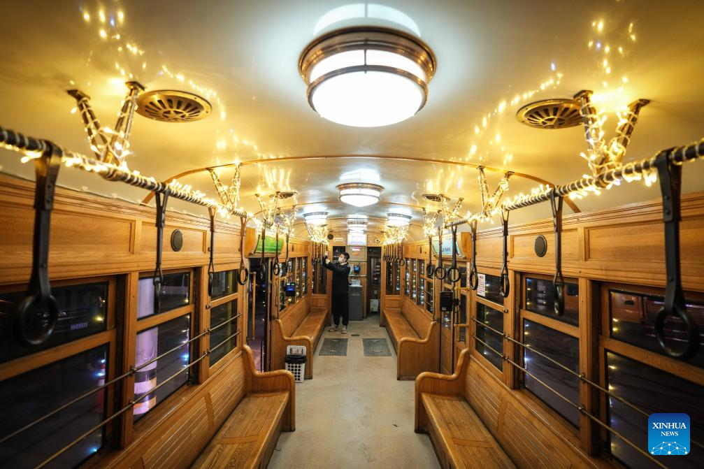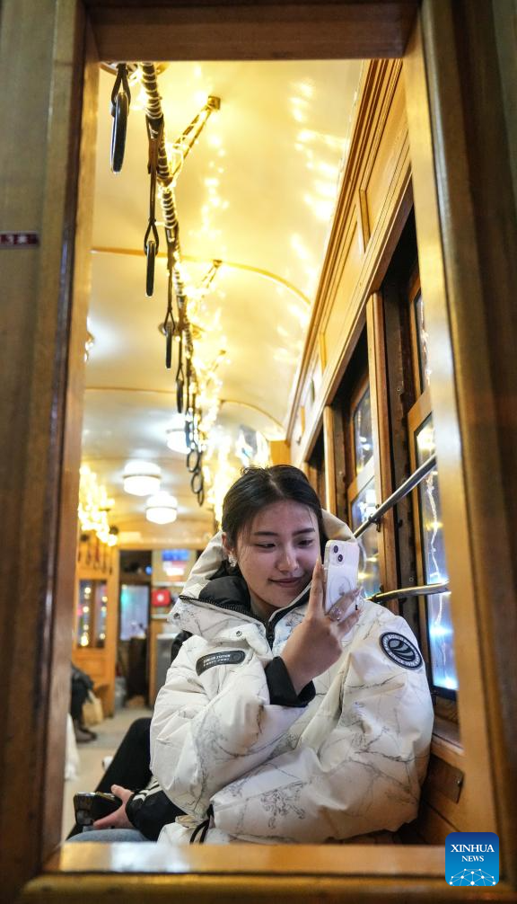 A tourist takes photos in the No. 201 tram in Dalian, northeast China's Liaoning Province, Jan. 8, 2024. Since Dec. 31, 2023, several trams in Dalian have been decorated with lights in order to attract more tourists. The history of tram in Dalian City dates back to 1909. After more than 100 years of operation, the tram has become a popular icon of the city. As the tourism industry in Dalian has recovered since 2023, many tourists come to take the trams to enjoy the cityscape. (Xinhua/Pan Yulong)