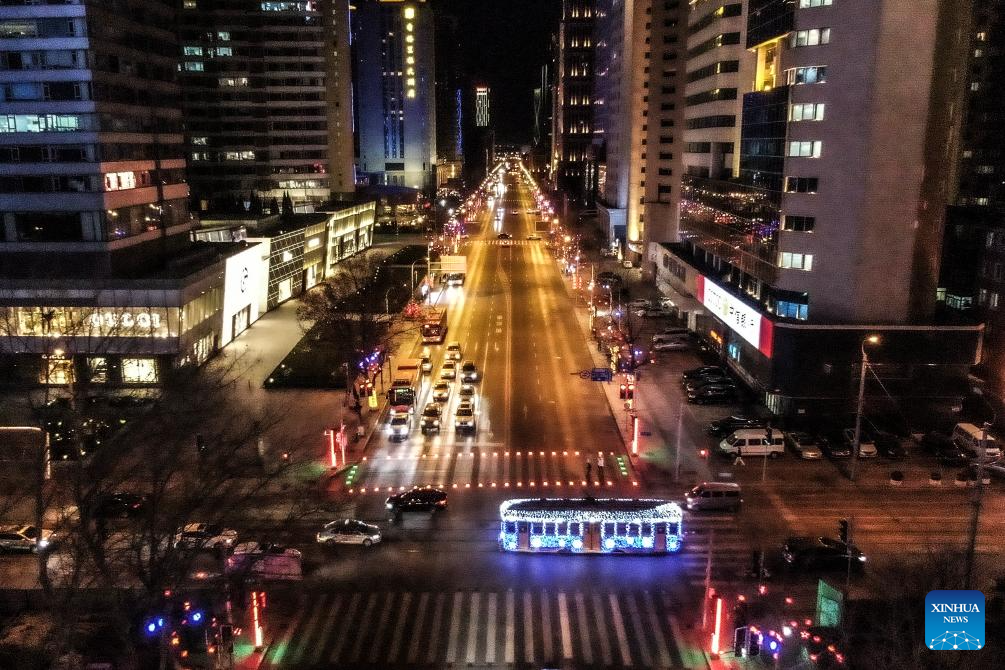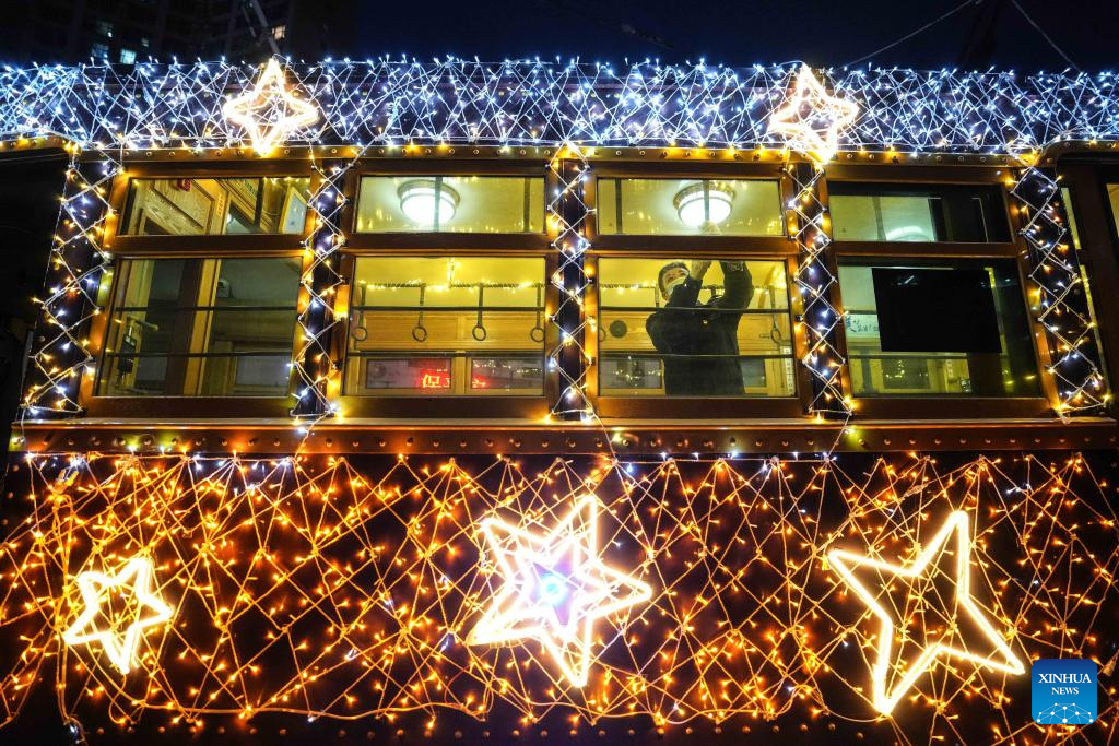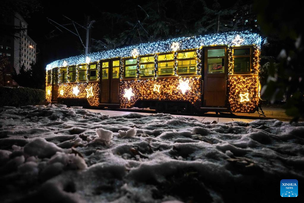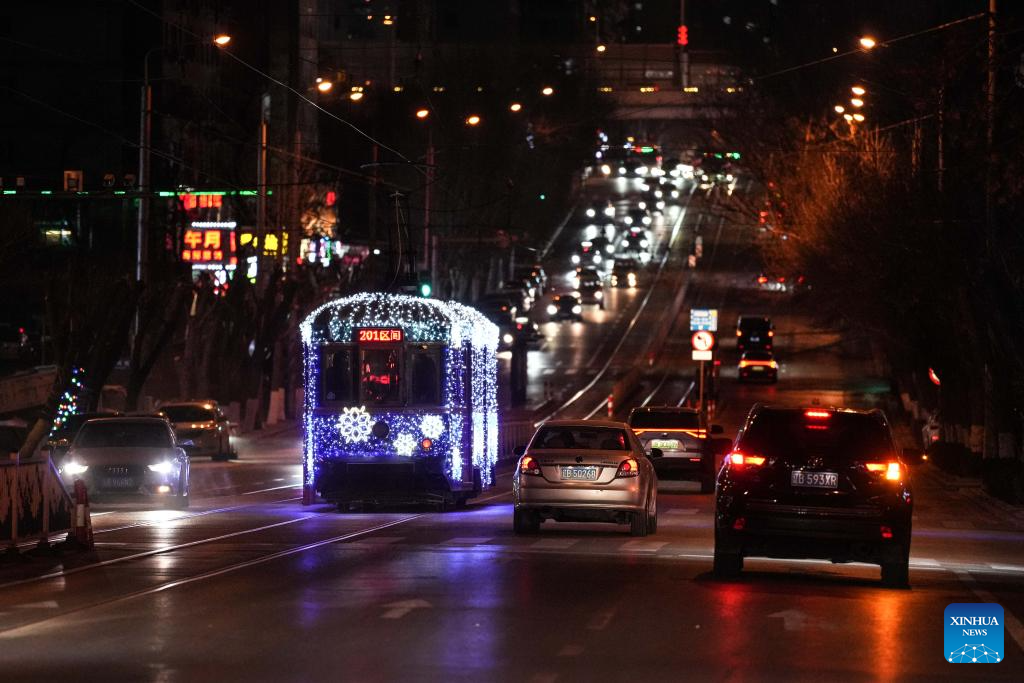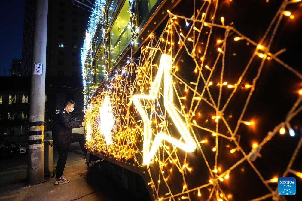 A tram decorated with lights is seen in Dalian, northeast China's Liaoning Province, Jan. 9, 2024. Since Dec. 31, 2023, several trams in Dalian have been decorated with lights in order to attract more tourists. The history of tram in Dalian City dates back to 1909. After more than 100 years of operation, the tram has become a popular icon of the city. As the tourism industry in Dalian has recovered since 2023, many tourists come to take the trams to enjoy the cityscape. (Xinhua/Pan Yulong)