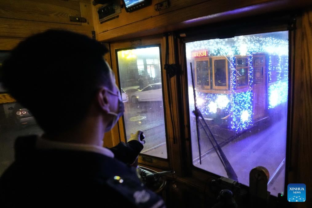 Tram driver Li Peng operates a tram in Dalian, northeast China's Liaoning Province, Jan. 8, 2024. Since Dec. 31, 2023, several trams in Dalian have been decorated with lights in order to attract more tourists. The history of tram in Dalian City dates back to 1909. After more than 100 years of operation, the tram has become a popular icon of the city. As the tourism industry in Dalian has recovered since 2023, many tourists come to take the trams to enjoy the cityscape. (Xinhua/Pan Yulong)