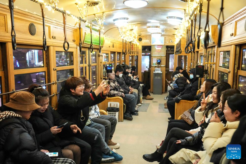 Tourists take the No. 201 tram in Dalian, northeast China's Liaoning Province, Jan. 8, 2024. Since Dec. 31, 2023, several trams in Dalian have been decorated with lights in order to attract more tourists. The history of tram in Dalian City dates back to 1909. After more than 100 years of operation, the tram has become a popular icon of the city. As the tourism industry in Dalian has recovered since 2023, many tourists come to take the trams to enjoy the cityscape. (Xinhua/Pan Yulong)