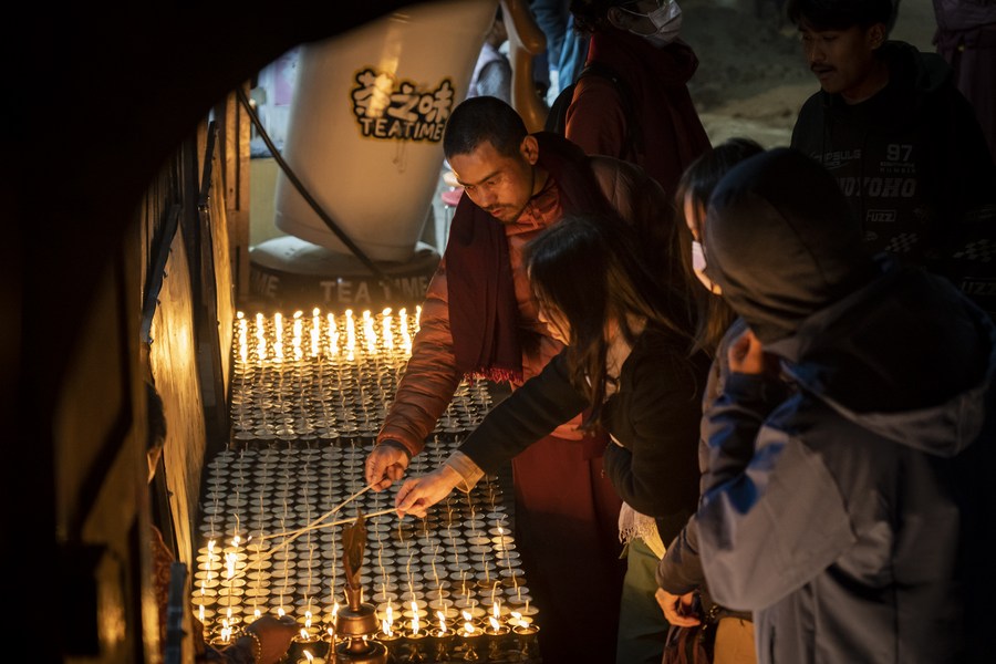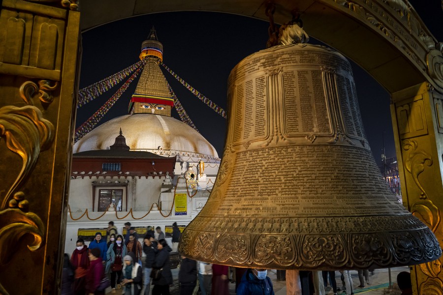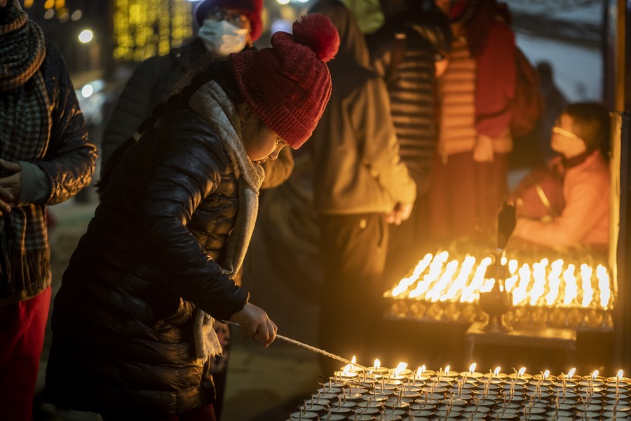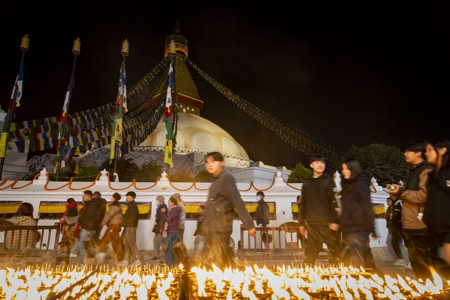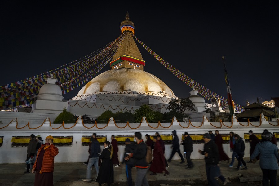 People light butter lamps after performing Kora on the premises of Boudhanath Temple in Kathmandu, Nepal, Jan. 12, 2024. (Photo by Hari Maharjan/Xinhua)