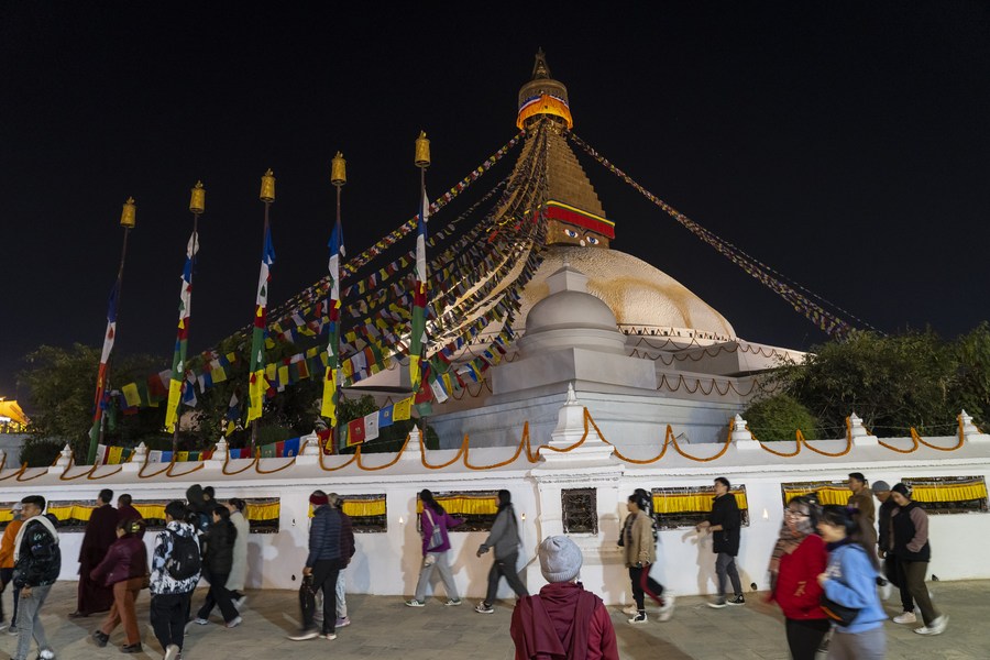 People perform Kora at Boudhanath Temple in Kathmandu, Nepal, on Jan. 12, 2024. (Photo by Hari Maharjan/Xinhua)