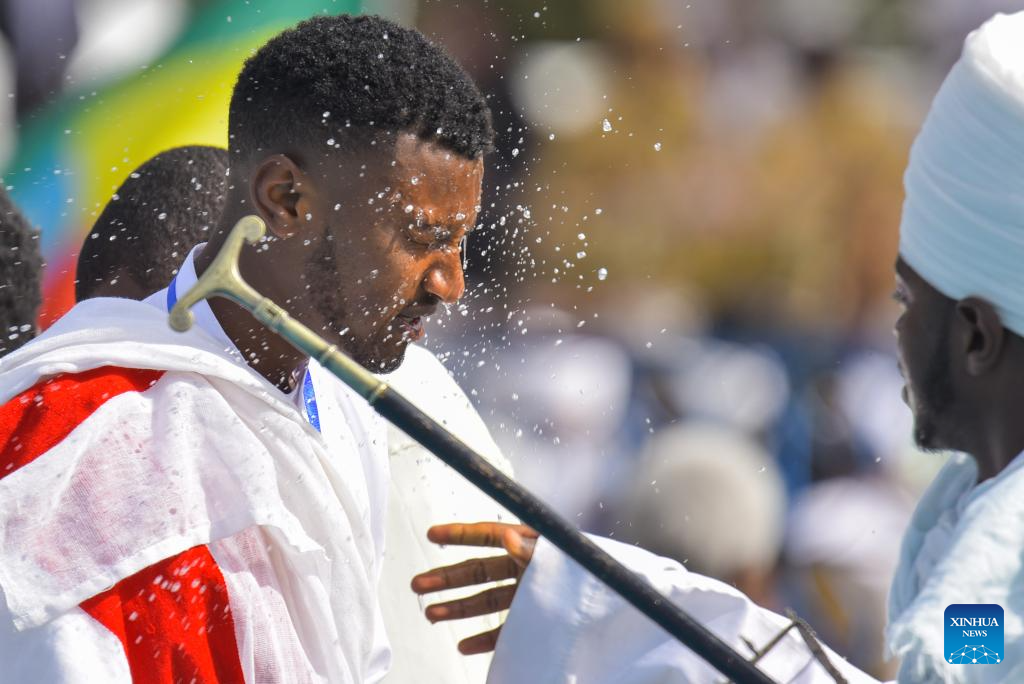 Holy water is sprinkled onto the crowds during Timket, the annual Ethiopian Epiphany festival, in Addis Ababa, the capital of Ethiopia, Jan. 20, 2024. Millions of people on Saturday celebrated Timket, the annual Ethiopian Epiphany festival, across Ethiopia, with government officials and religious leaders urging the faithful to maintain peace and the world's intangible cultural heritage. (Xinhua/Michael Tewelde)