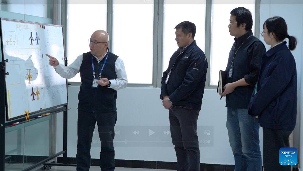 Ivan Chin (2nd L) works at Tianjin Haite Aircraft Engineering Co., Ltd. in north China's Tianjin Municipality, Jan. 15, 2024. (Xinhua/Yang Zichun)