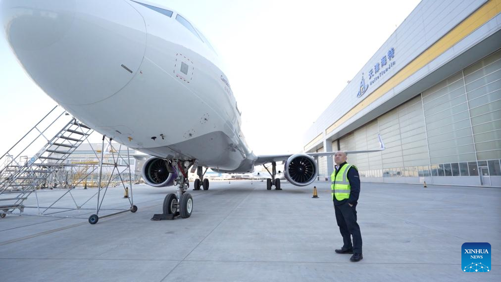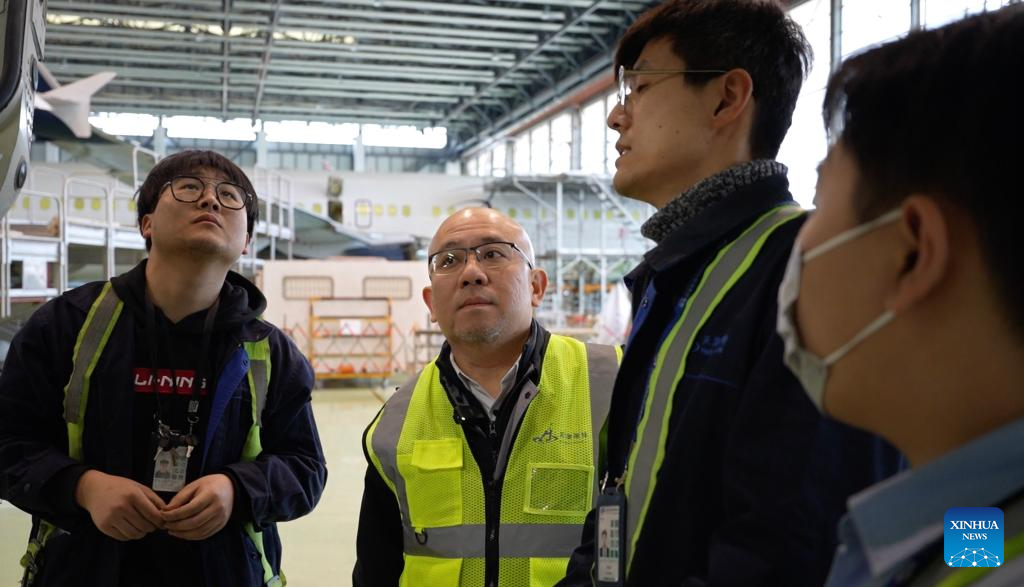 Ivan Chin (1st L) works at Tianjin Haite Aircraft Engineering Co., Ltd. in north China's Tianjin Municipality, Jan. 15, 2024. (Xinhua/Yang Zichun)
