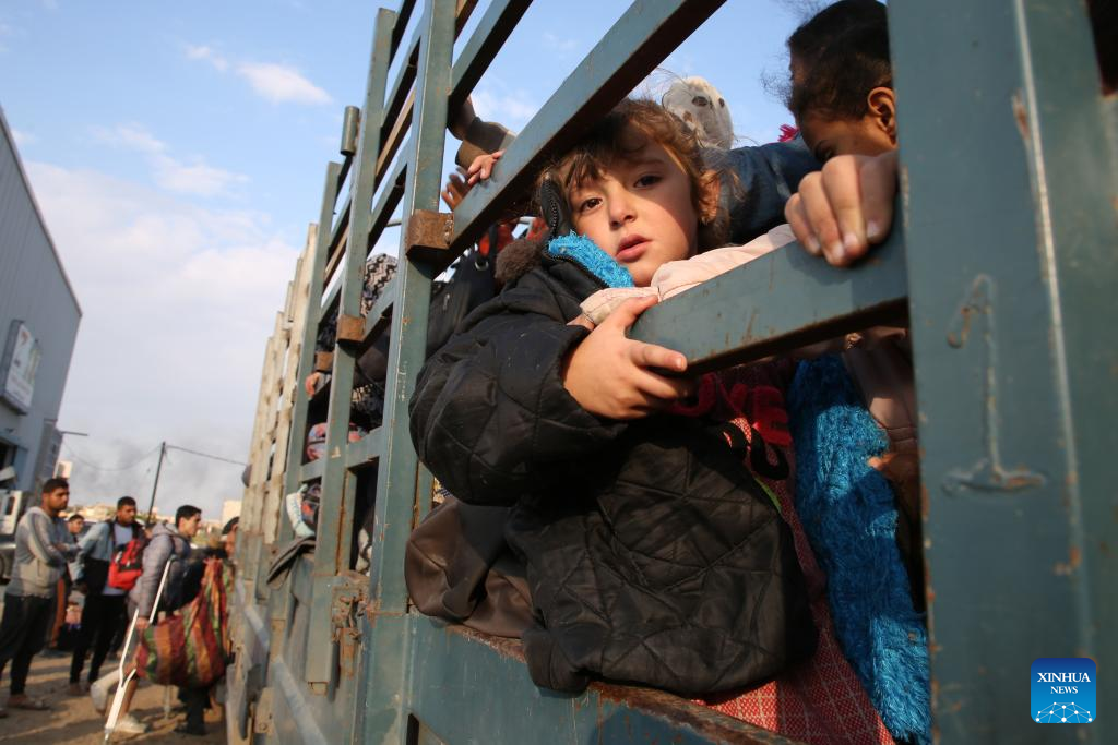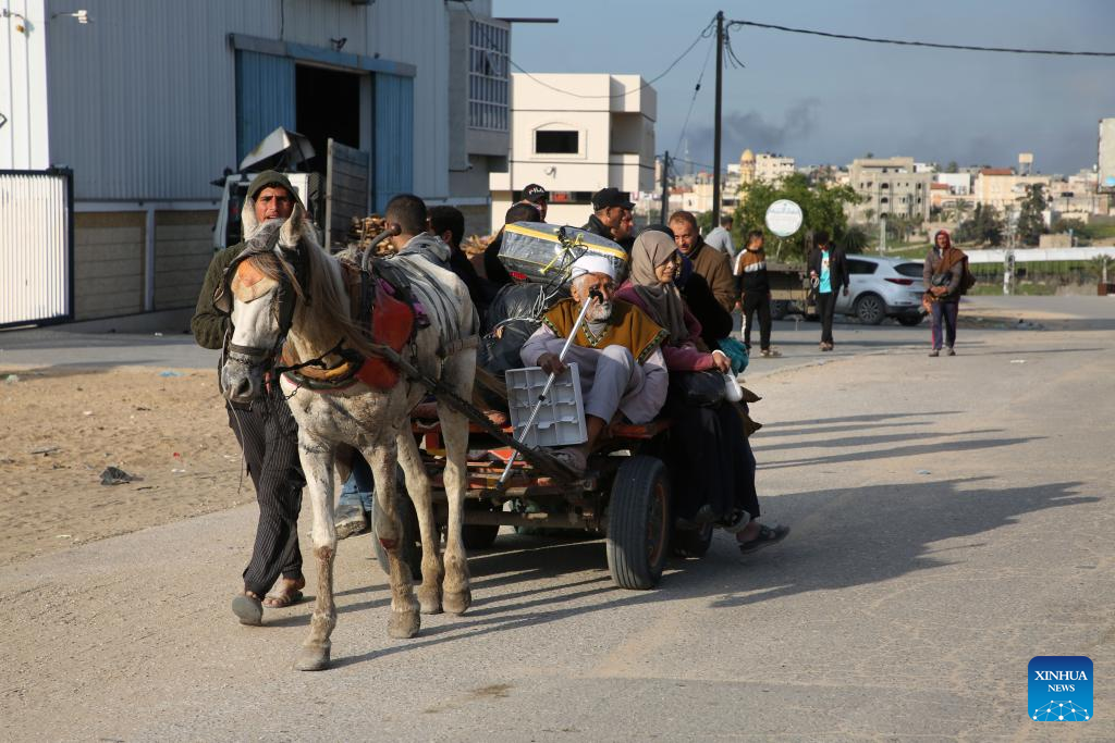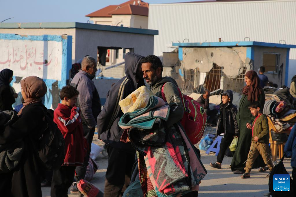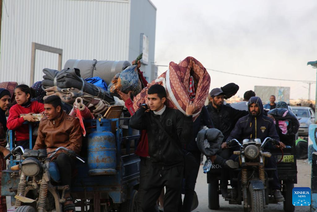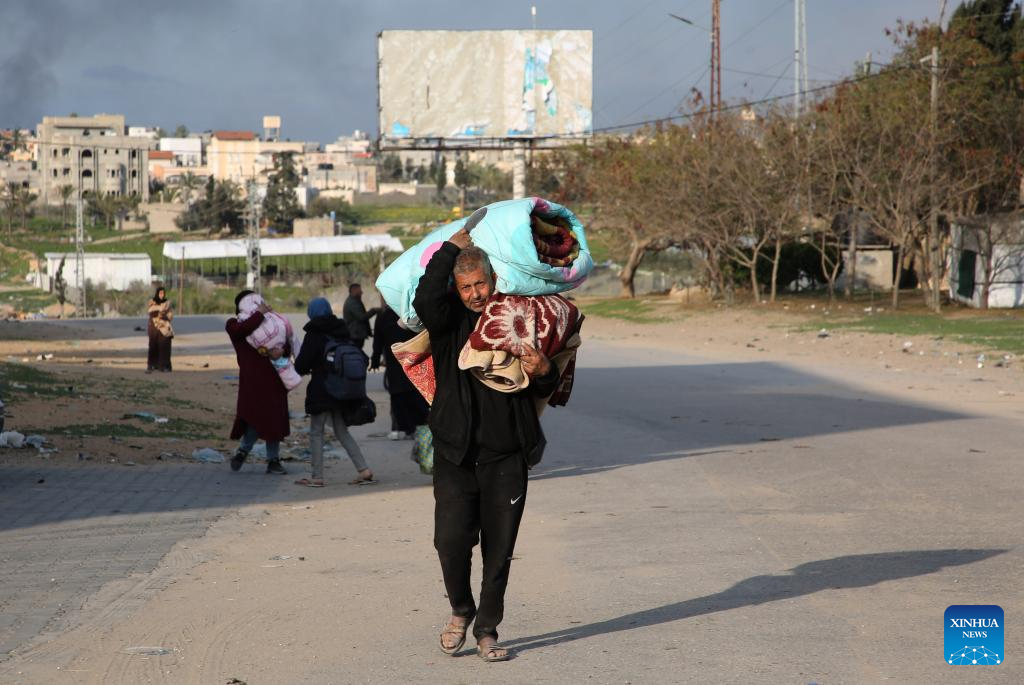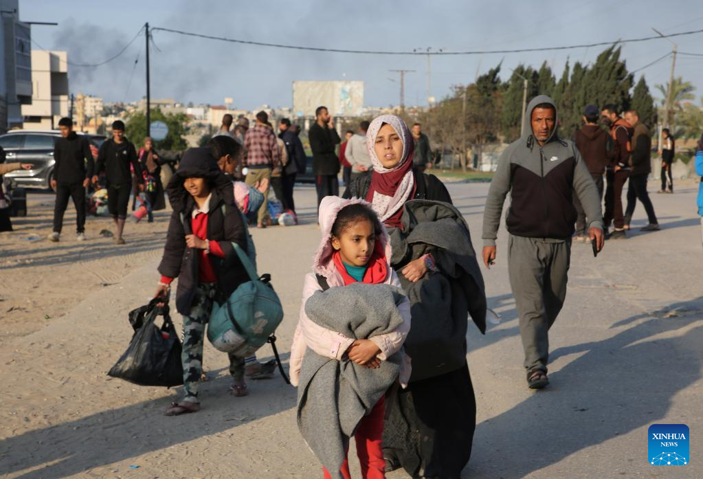 People leave their home after Israeli bombings in the southern Gaza Strip city of Khan Younis, on Feb. 14, 2024. The Palestinian death toll in the Gaza Strip has risen to 28,576 with 68,291 others wounded since the Israel-Hamas conflict broke out on Oct. 7, 2023, the Hamas-health ministry said in a press statement on Wednesday. (Photo by Khaled Omar/Xinhua)