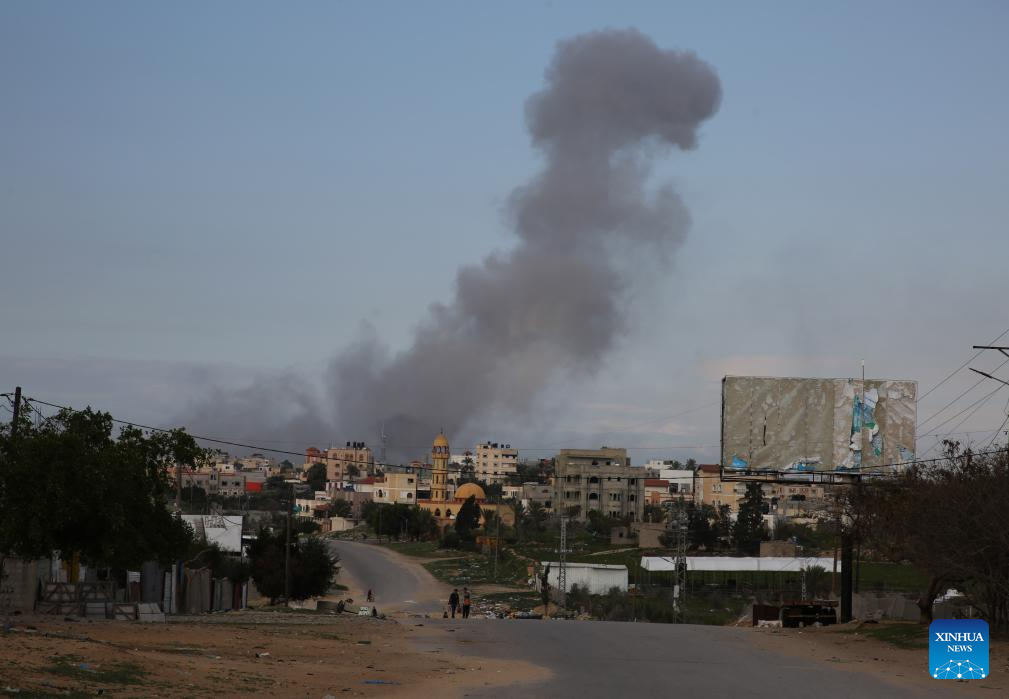 Smoke rises after Israeli bombings in the southern Gaza Strip city of Khan Younis, on Feb. 14, 2024. The Palestinian death toll in the Gaza Strip has risen to 28,576 with 68,291 others wounded since the Israel-Hamas conflict broke out on Oct. 7, 2023, the Hamas-health ministry said in a press statement on Wednesday. (Photo by Khaled Omar/Xinhua)