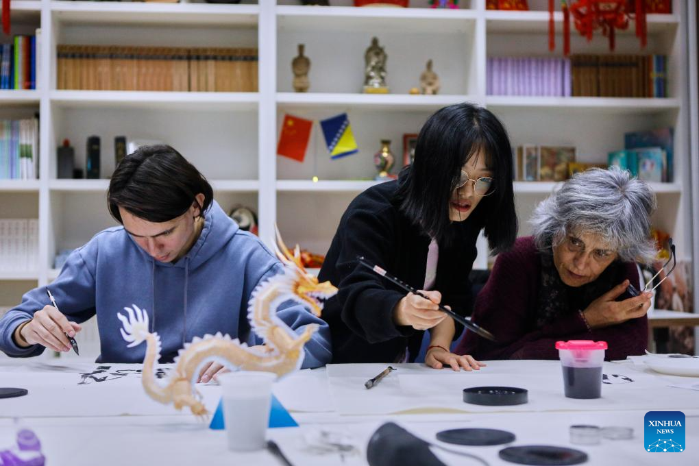 Volunteer Zhu Fangfang (C) instructs a student during a Chinese painting class at the Confucius Institute of Sarajevo University in Sarajevo, Bosnia and Herzegovina, on Feb. 21, 2024. The Confucius Institute of Sarajevo University started the new semester with a Chinese painting lesson after the Chinese New Year. (Photo by Jasmin Brutus/Xinhua)