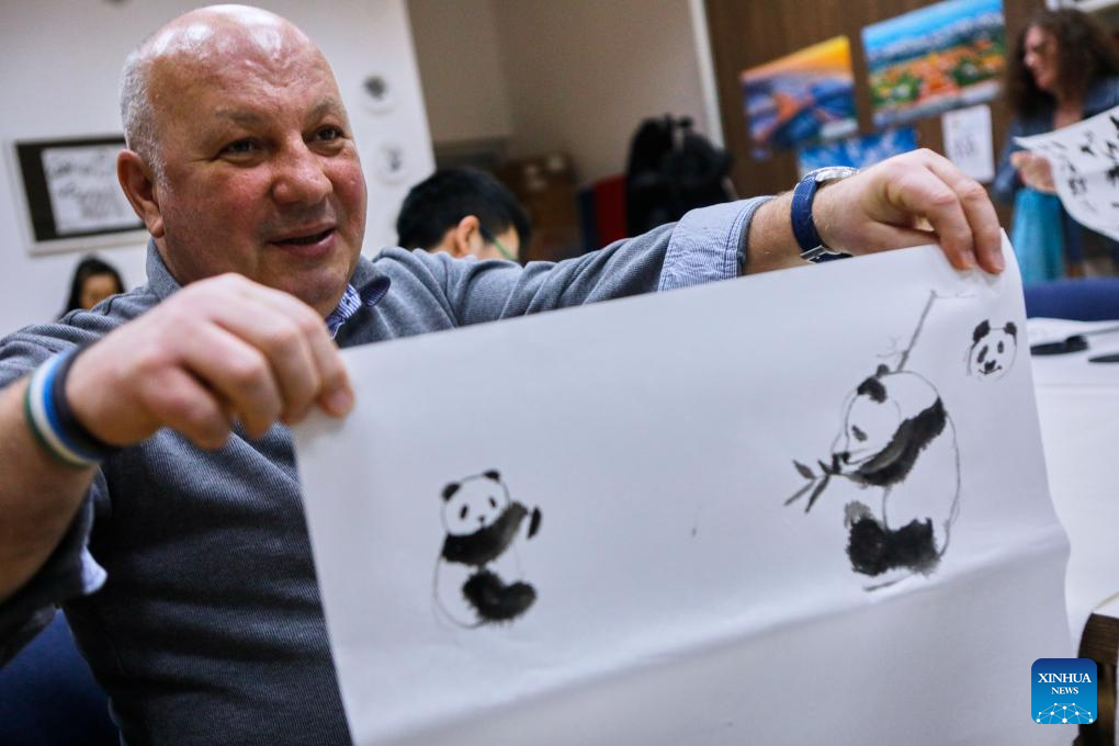 A student shows his painting during a Chinese painting class at the Confucius Institute of Sarajevo University in Sarajevo, Bosnia and Herzegovina, on Feb. 21, 2024. The Confucius Institute of Sarajevo University started the new semester with a Chinese painting lesson after the Chinese New Year. (Photo by Jasmin Brutus/Xinhua)