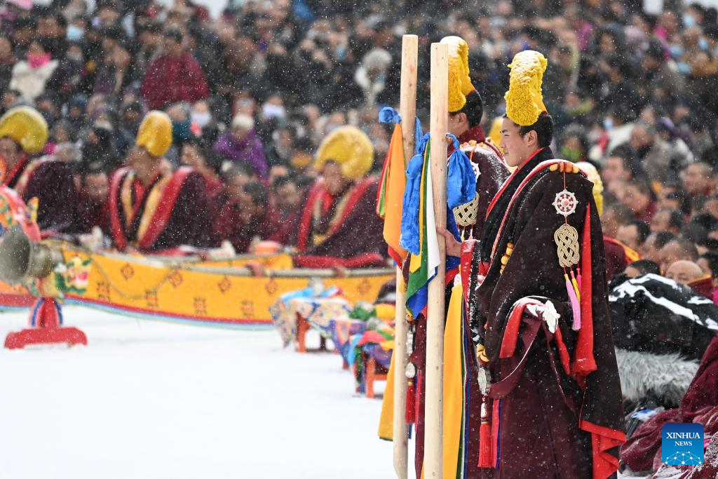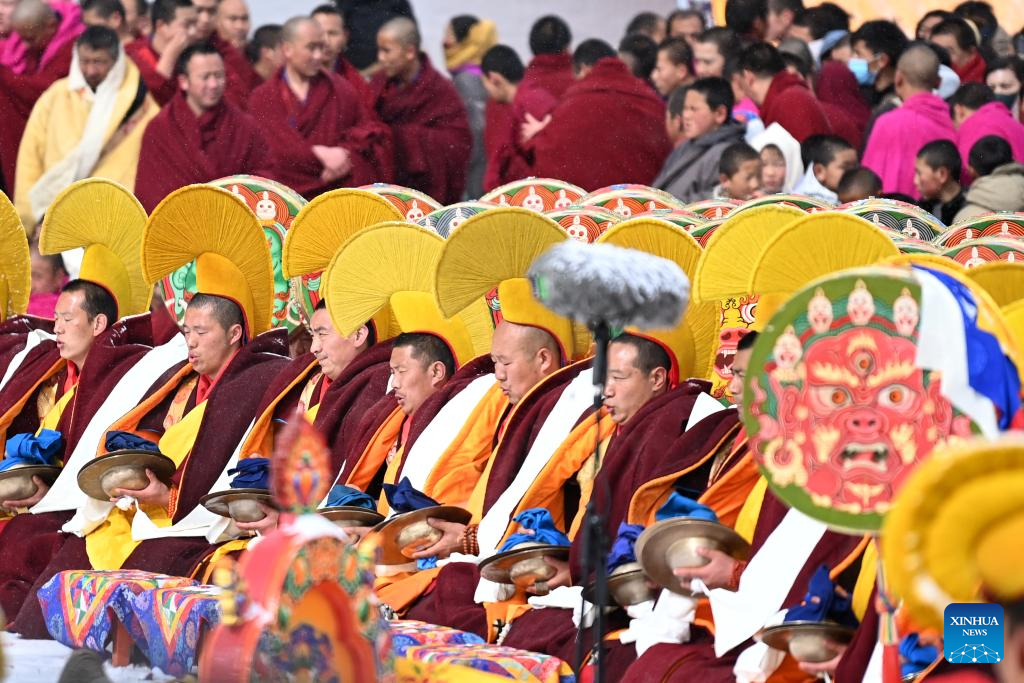 Lamas play music during the exorcism dance performance at a square in the Labrang Monastery in Xiahe County, northwest China's Gansu Province, Feb. 23, 2024. The Labrang Monastery held the annual event of exorcism dance to pray for good luck in the new year. Built in 1709, Labrang Monastery is one of the six great monasteries of the Gelug Sect of Tibetan Buddhism. (Xinhua/Chen Bin)