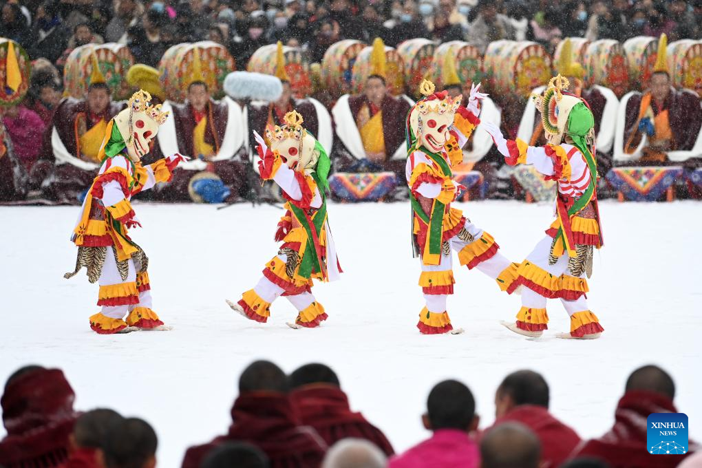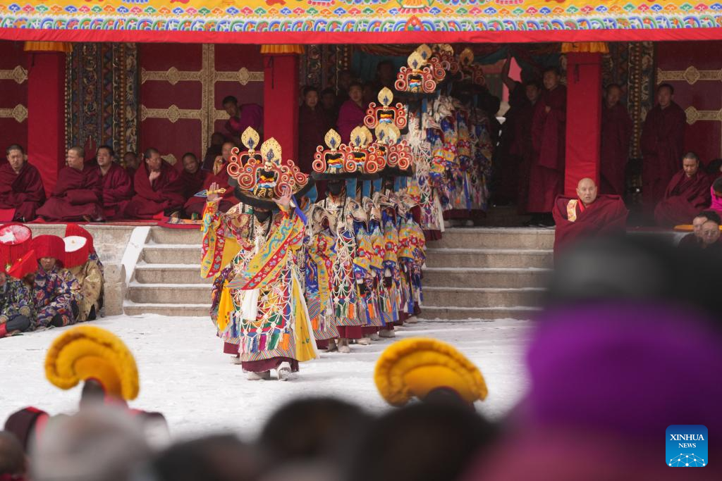 Lamas are pictured during the exorcism dance performance at the Labrang Monastery in Xiahe County, northwest China's Gansu Province, Feb. 23, 2024. The Labrang Monastery held the annual event of exorcism dance to pray for good luck in the new year. Built in 1709, Labrang Monastery is one of the six great monasteries of the Gelug Sect of Tibetan Buddhism. (Xinhua/Chen Bin)